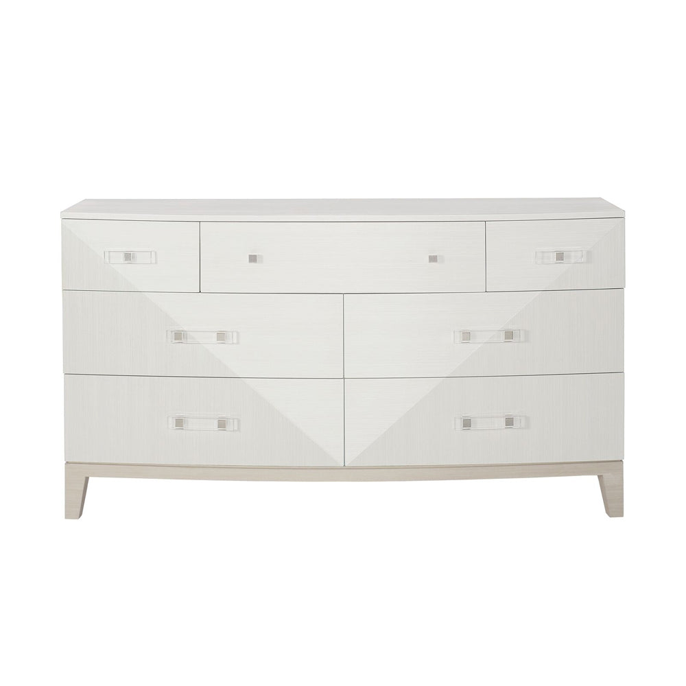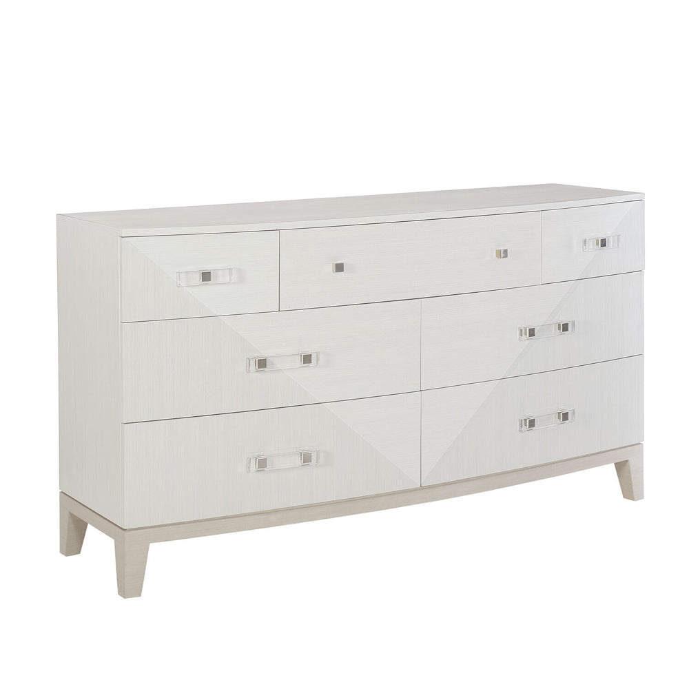 This dresser offers a unique material story, blending veneers with acrylic and metal accents in a clean, sleek form. Crafted from poplar solids and engineered faux anigre veneers, the Axiom dresser features a softly curved front with a unique inverted pyramid design. Three silky yet low-sheen finishes form a subtle, sophisticated palette. Clear acrylic is combined with metal for hardware with a fresh and unique feel. With clean lines and a sleek form, this seven-drawer dresser remains a warm and inviting staple for the bedroom.