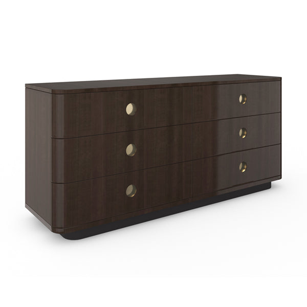 Long, dark and handsome, this dresser uses hand-applied Tupelo veneers with a high-gloss Otter finish to achieve its suave demeanor. The six drawers have rounded front edges and are punctuated by six recessed porthole pulls in Champagne Gold. The soft-closing drawers open to deep cases finished in UV Noir. The Dark Chocolate base is reset as a finishing touch.