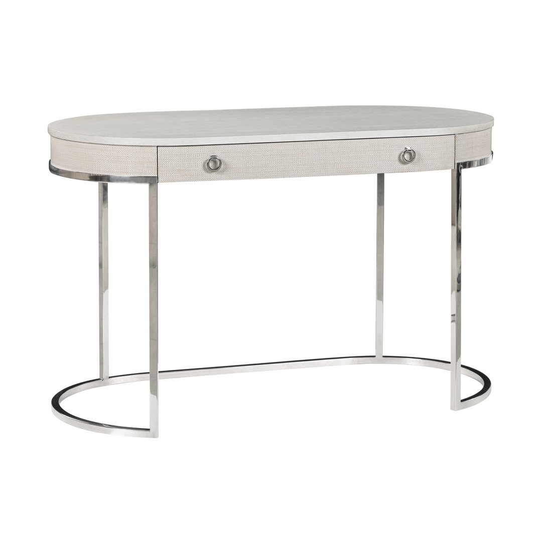 Our Bay Harbor Vanity Desk features a smooth top, shelving, one storage drawer, a raffia detail, and a polished silver base and legs.