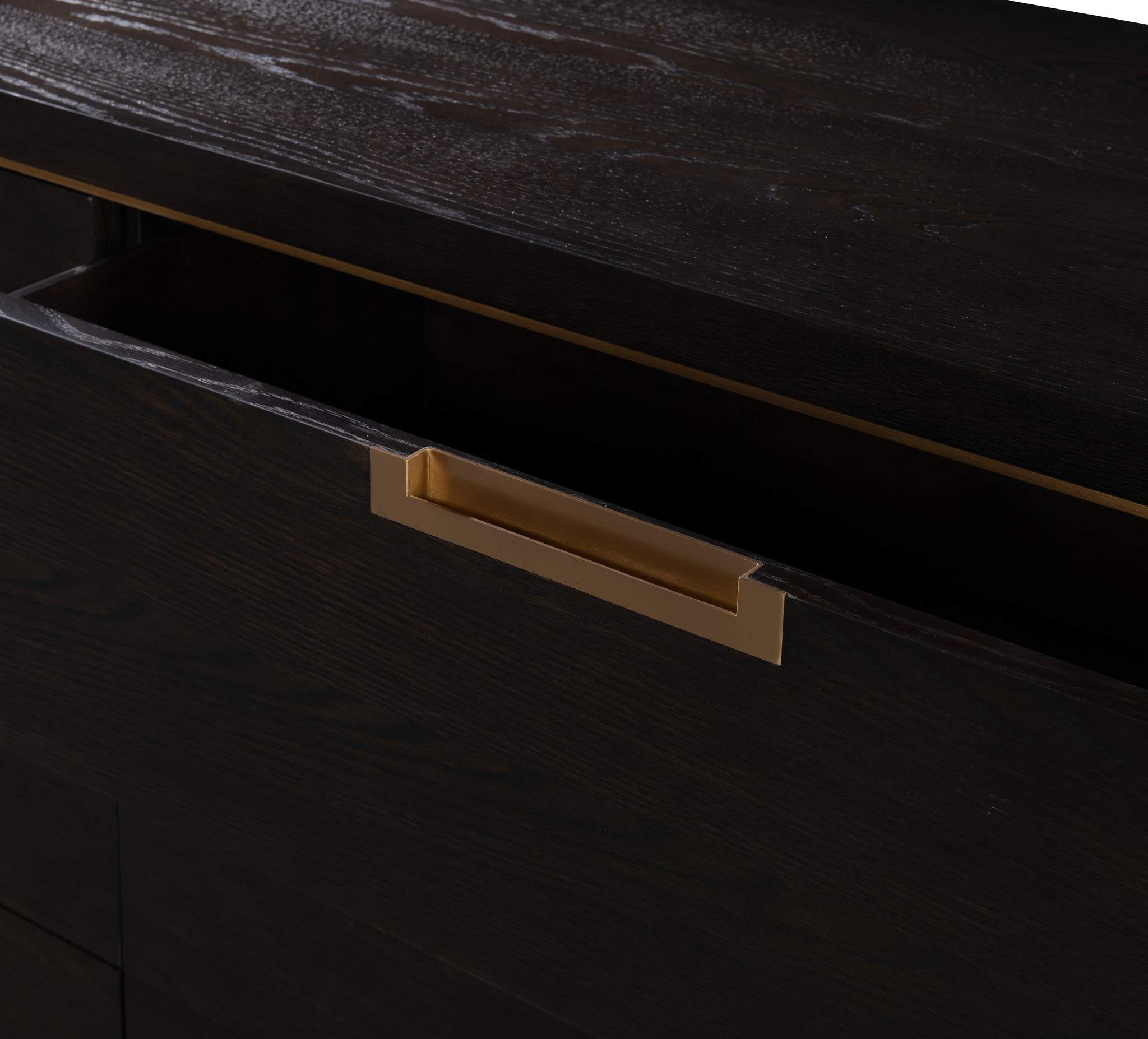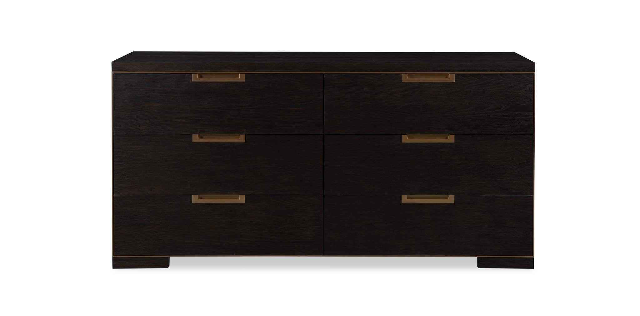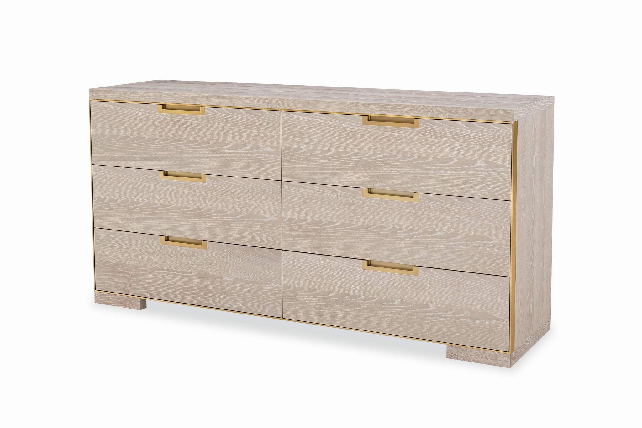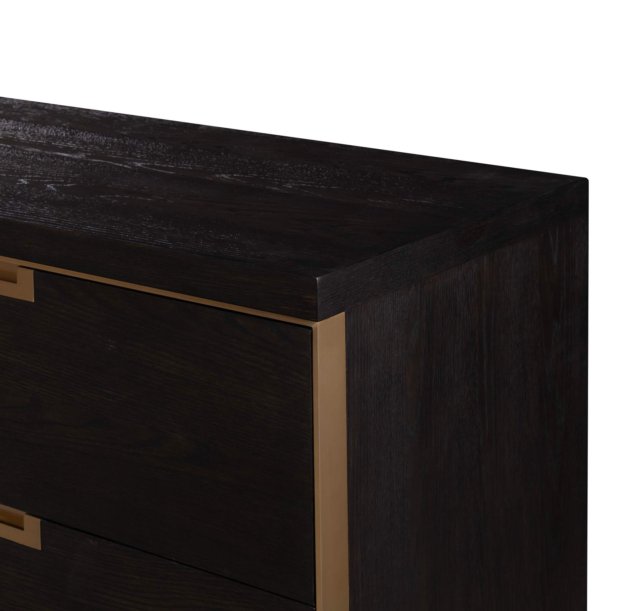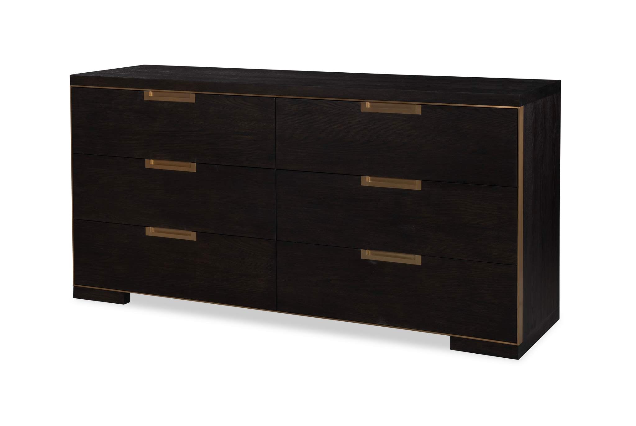 Crafted from Oak Solids and Narrow Heart Oak Veneer the Cadence Six Drawer Dresser is reminiscent of Campaign style furnishings with the Antique Brass trim framing the six, soft close drawers, and the Antique Brass drawer pulls recessed into each drawer.