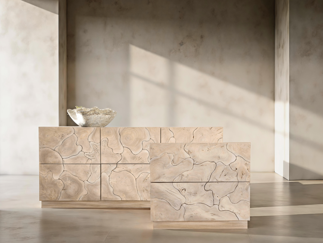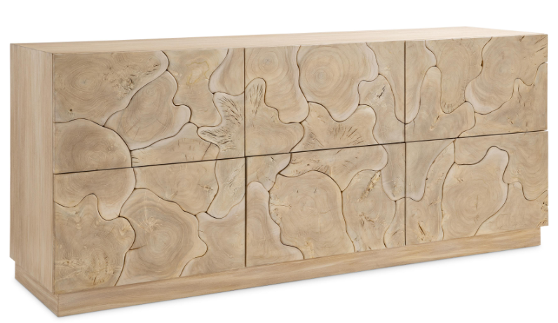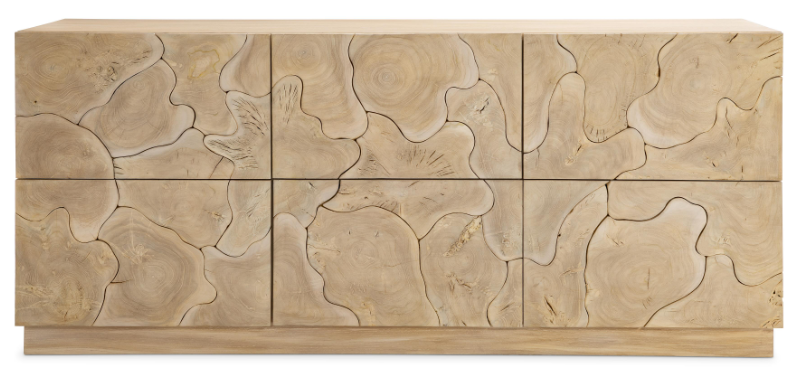 Slices of natural teak form a chic pattern on this stunning dresser. A simple minimalist form combines with the beautiful organic texture of teak for the Calavaras dresser. The design draws all eyes, with its open-work pattern of sliced teak on six push-to-open drawers. Finished in Bleached Teak, the dresser rests on a plinth base.