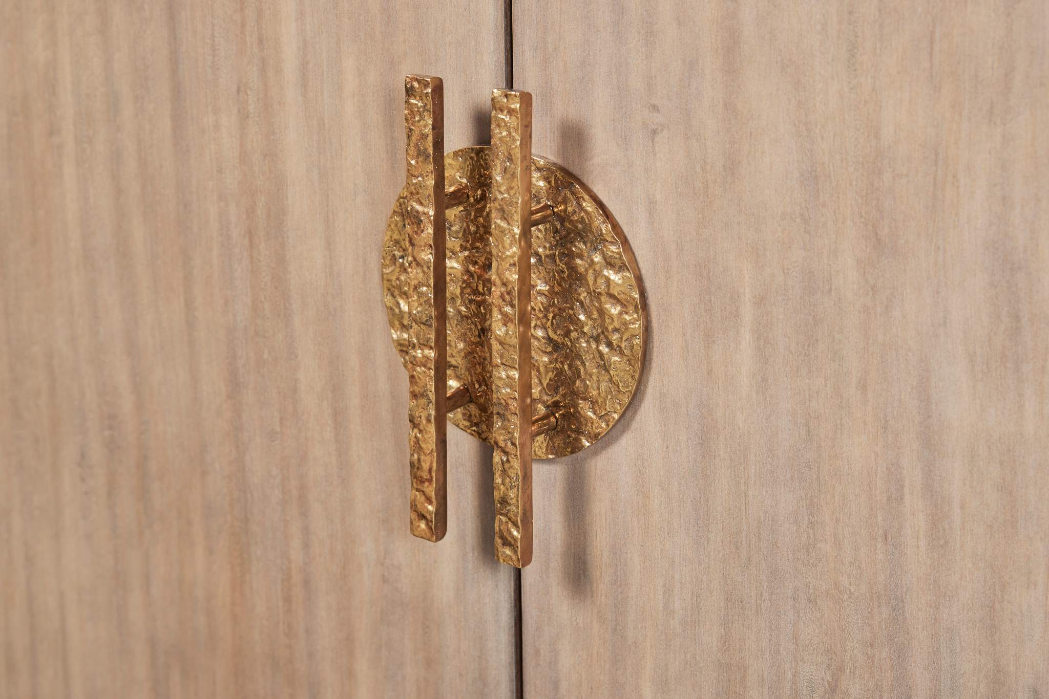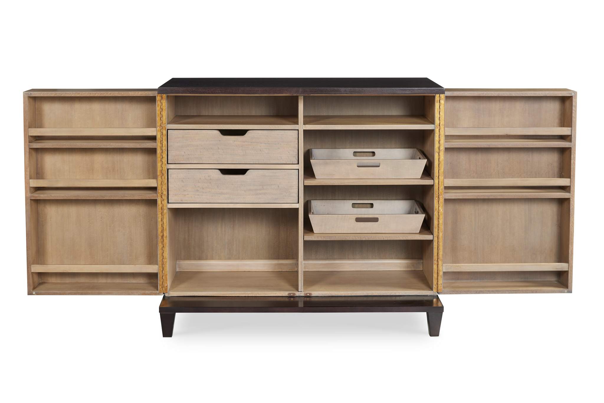 The Damon Two Door Chest is crafted from mahogany solids and Eucalyptus veneer finished in a grey wash finish on the body that is contrasted with a dark stained top and base. The hardware is cast in antique brass with a heavily textured back plate and rectangular bar pulls. Exposed hinges on the sides are also antique brass. Behind both doors are three deep storage shelves. On the left side are an open shelf above two drawers with an open space underneath, while on the right side a fixed upper shelf sits above two adjustable shelves.