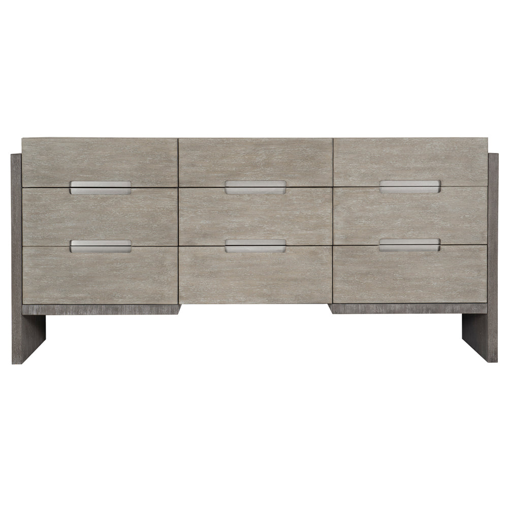 Crafted from weathered acacia featuring stainless steel pulls, this stylish nine-drawer dresser brings a casual, contemporary feel. Foundations is a new, refined expression of modern rustic, defined by a minimalist style and relaxed comfort. Crafted from weathered acacia, the Foundations dresser is right at home in a laid-back bedroom. Nine drawers are accented by handsome brushed stainless steel pulls, all bracketed by a contrasting wooden frame with a partly open back.
