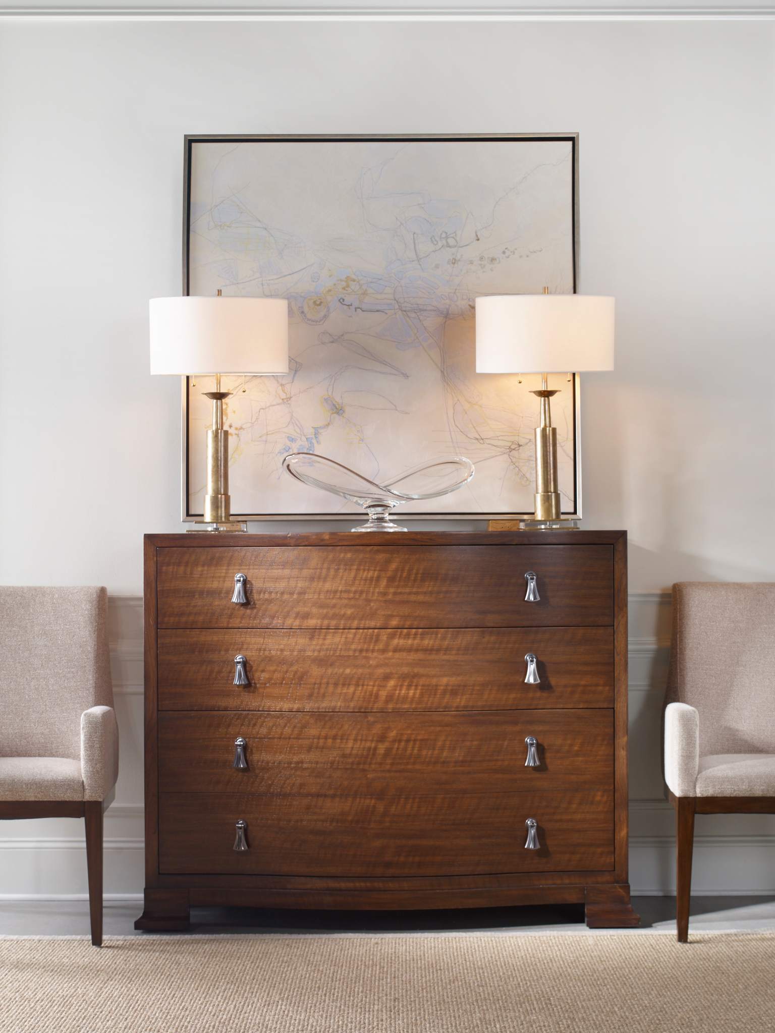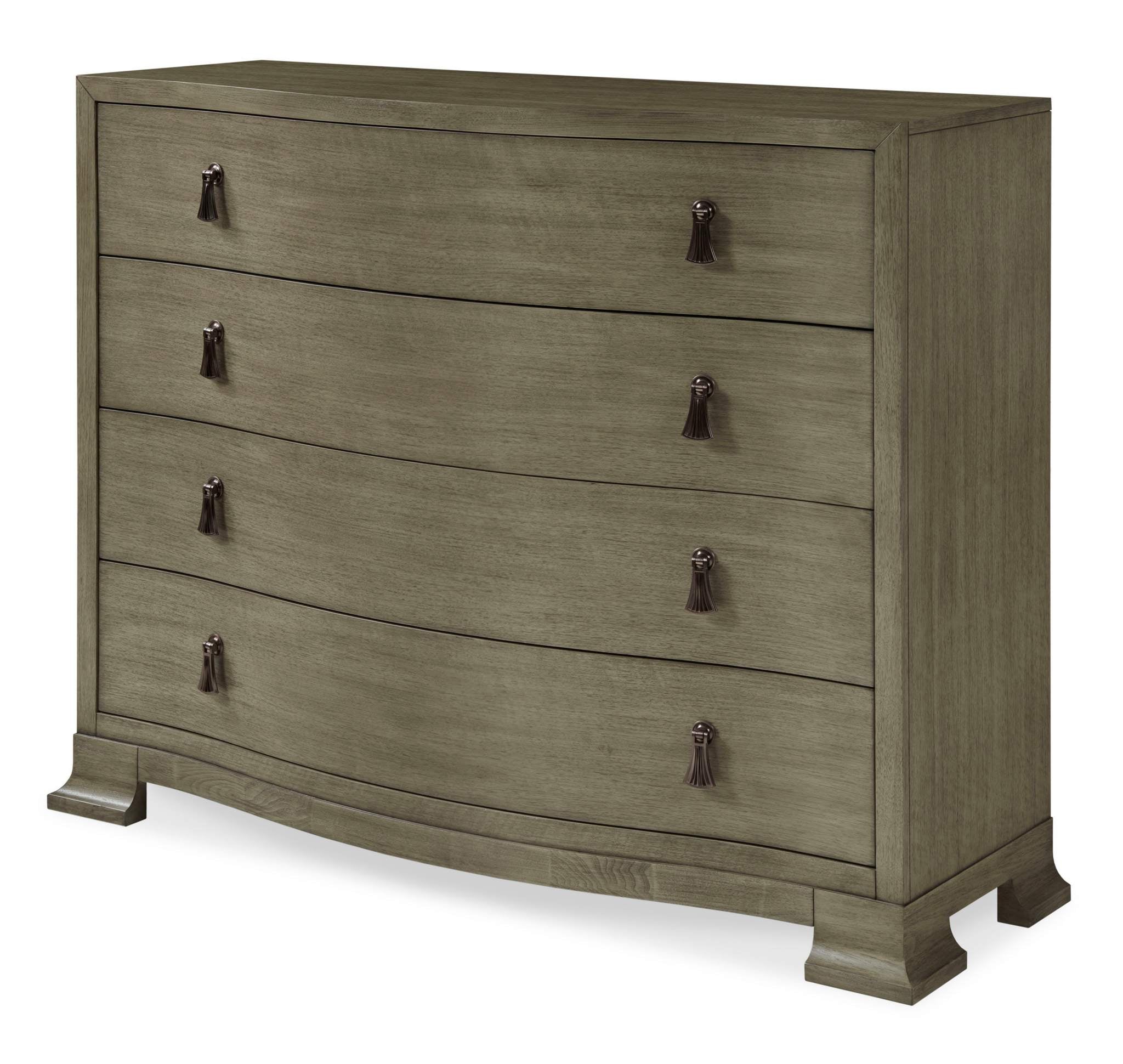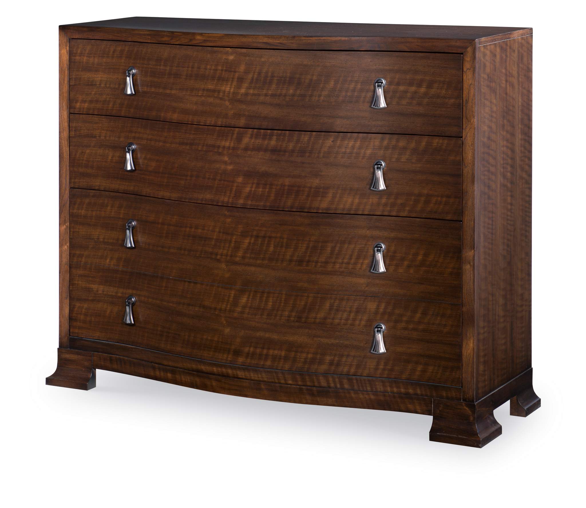 Crafted from Walnut and poplar solids and figured Walnut veneers, the Frasier Serpentine Master Chest features a beautiful shaped front, four large drawers for ample storage each with double placed Pewter finished metal tassel pulls.