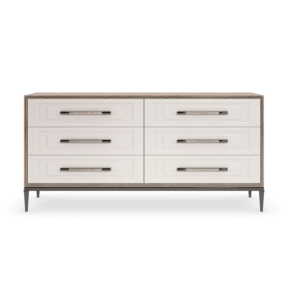 Designed with the utmost attention to detail and materials, this sophisticated dresser is well-suited for a casual retreat or a stately bedchamber. Stepped drawer fronts in a Pearly White finish create subtle shadow and dimension, called to attention by jewelry-like custom hardware with a ceramic inlay. Six spacious drawers are framed in Deep Bronze metal trim and encased in Silver Curupixa veneers, finished in Mountain Smoke to highlight its luxurious, figured wood grain.