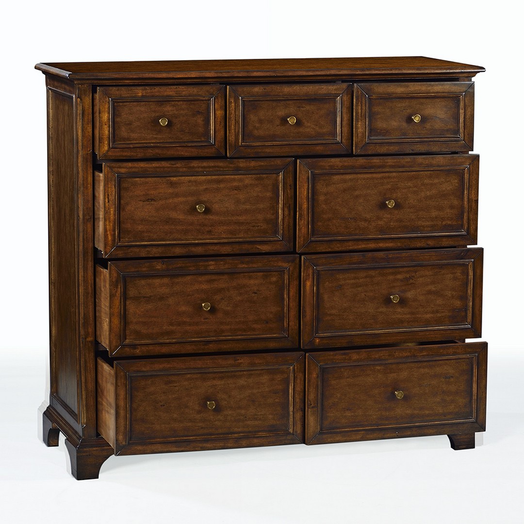 Our Lakewood Chest features a smooth top with nine storage drawers, OGEE top edge, trimmed corners, decorative inset panels, and turned brass knobs