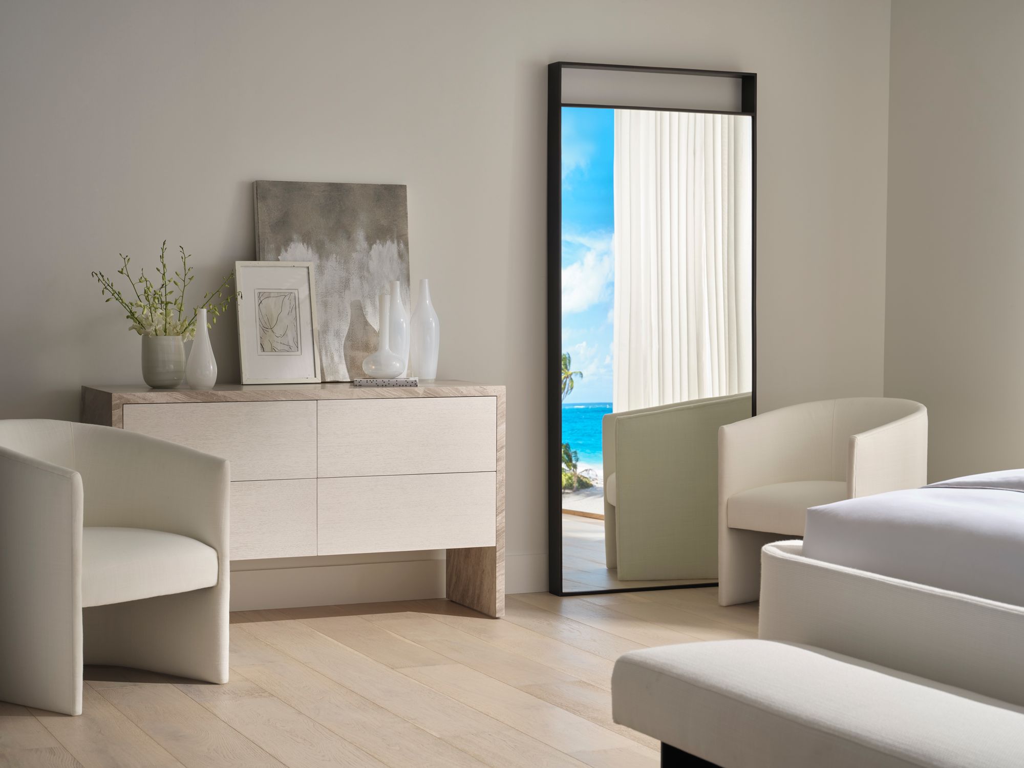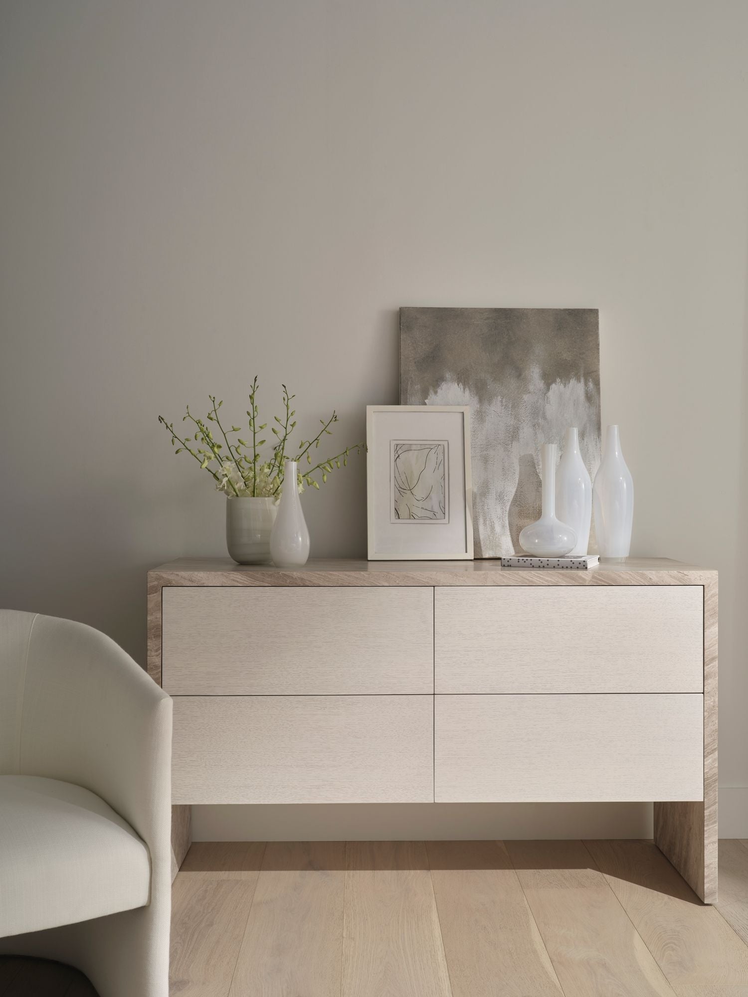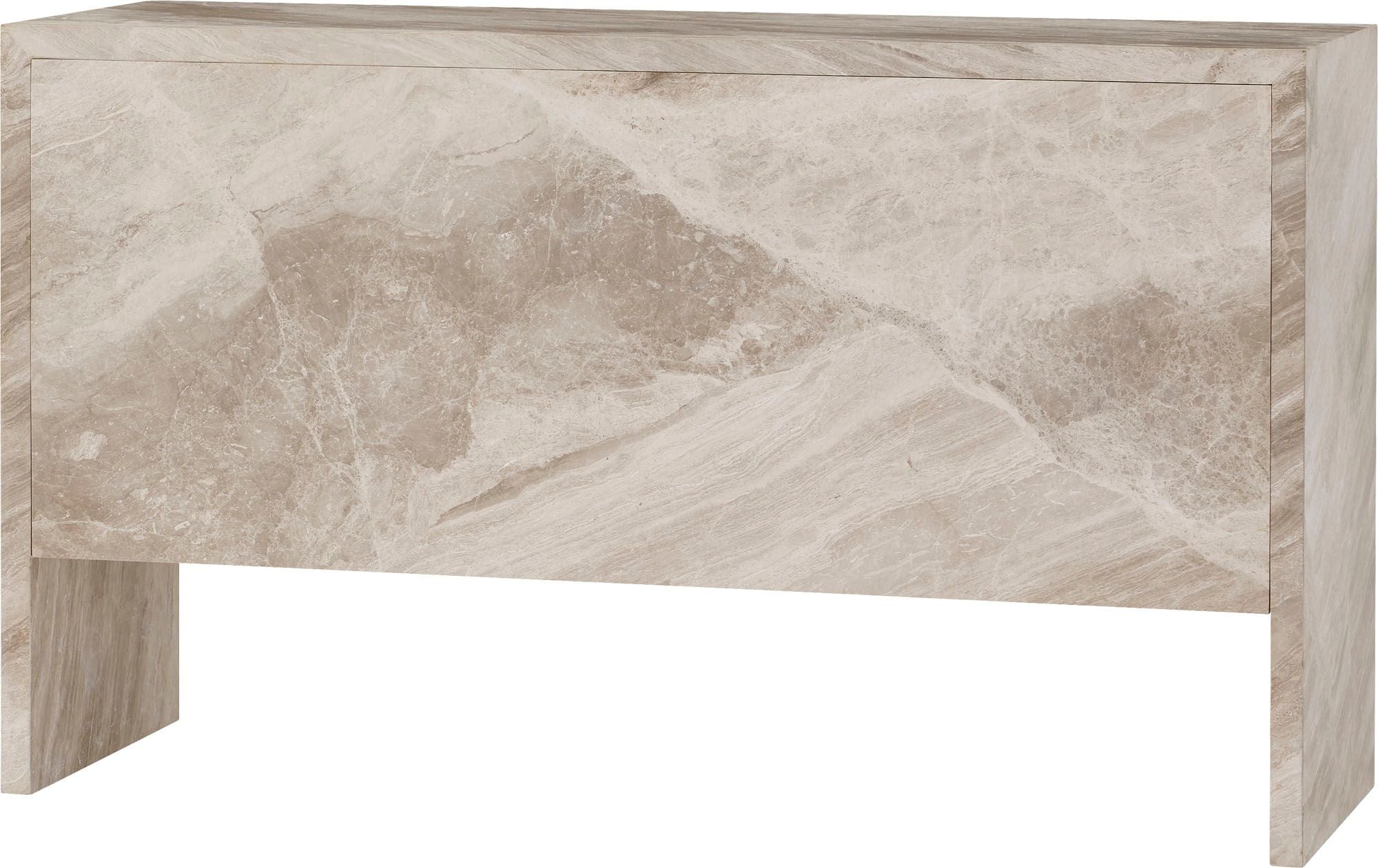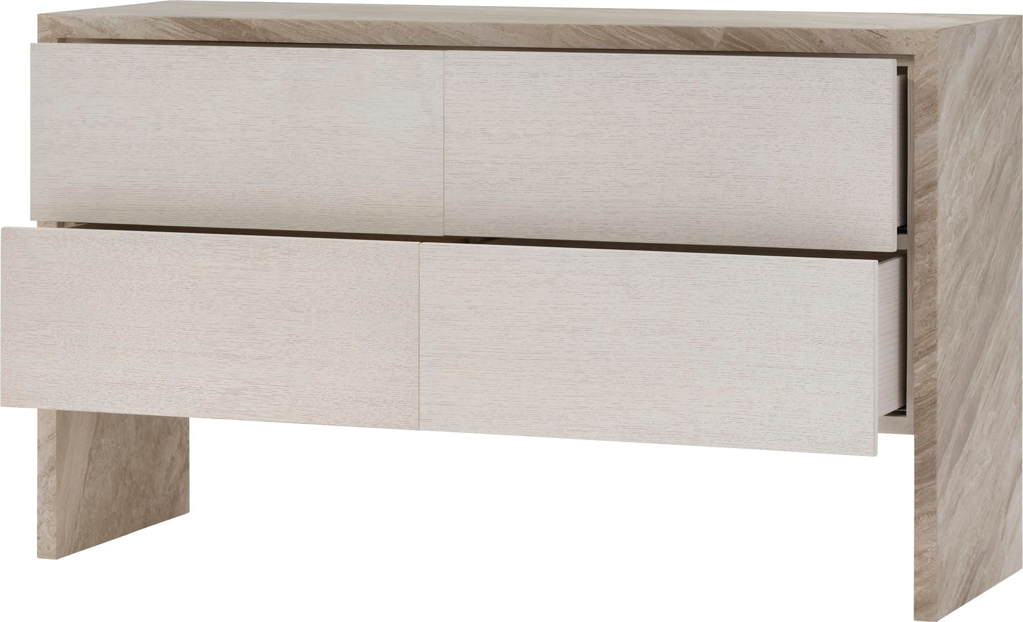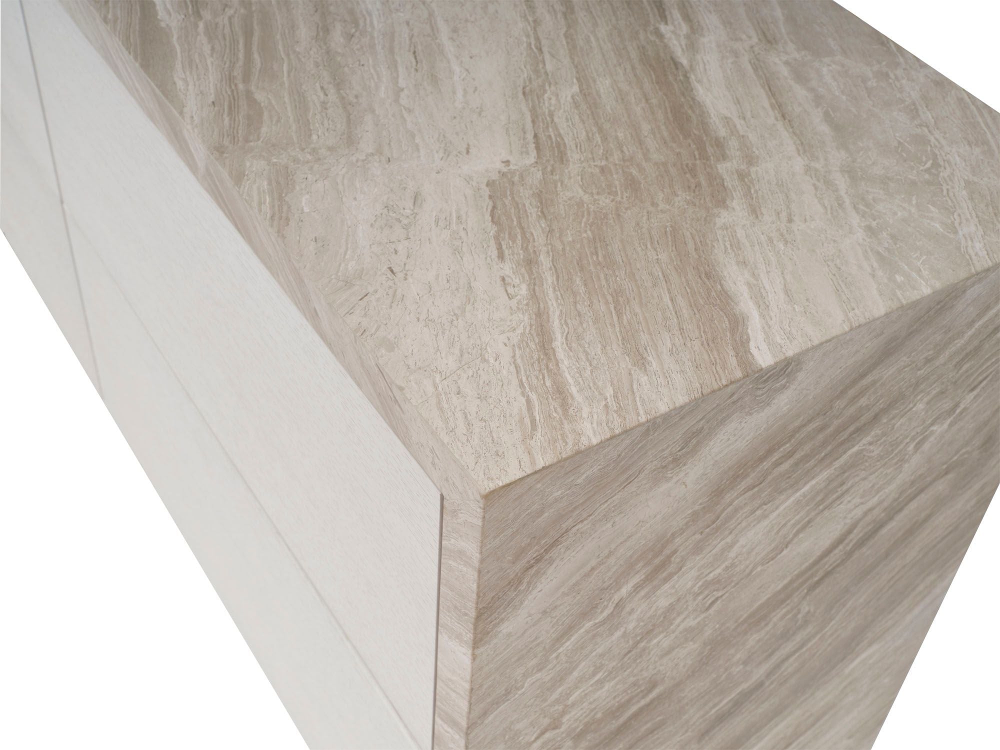 The Lido Dresser is a vision of seaside living crafted in Lena Grey Marble and sun-drenched Oyster oak. It features a clean, crisp silhouette and an earthy color palette, with natural tones and soft neutrals that mimic the colors of the shoreline.