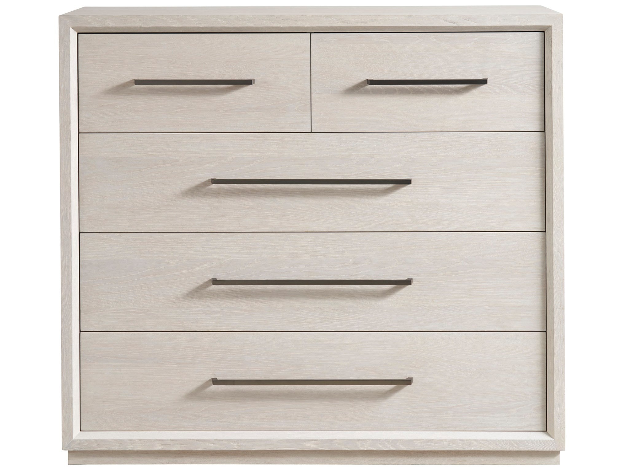 The Astrid Drawer Chest stands tall with five drawers, embodying a sleek and breezy modernity in a gorgeous neutral White Oak Finish:. Its stature is gracefully accentuated by long, chic bronzed pull hardware, adding a touch of sophistication to this functional piece. The chest's design strikes a balance between contemporary flair and timeless elegance, making it a versatile addition to any modern bedroom.
