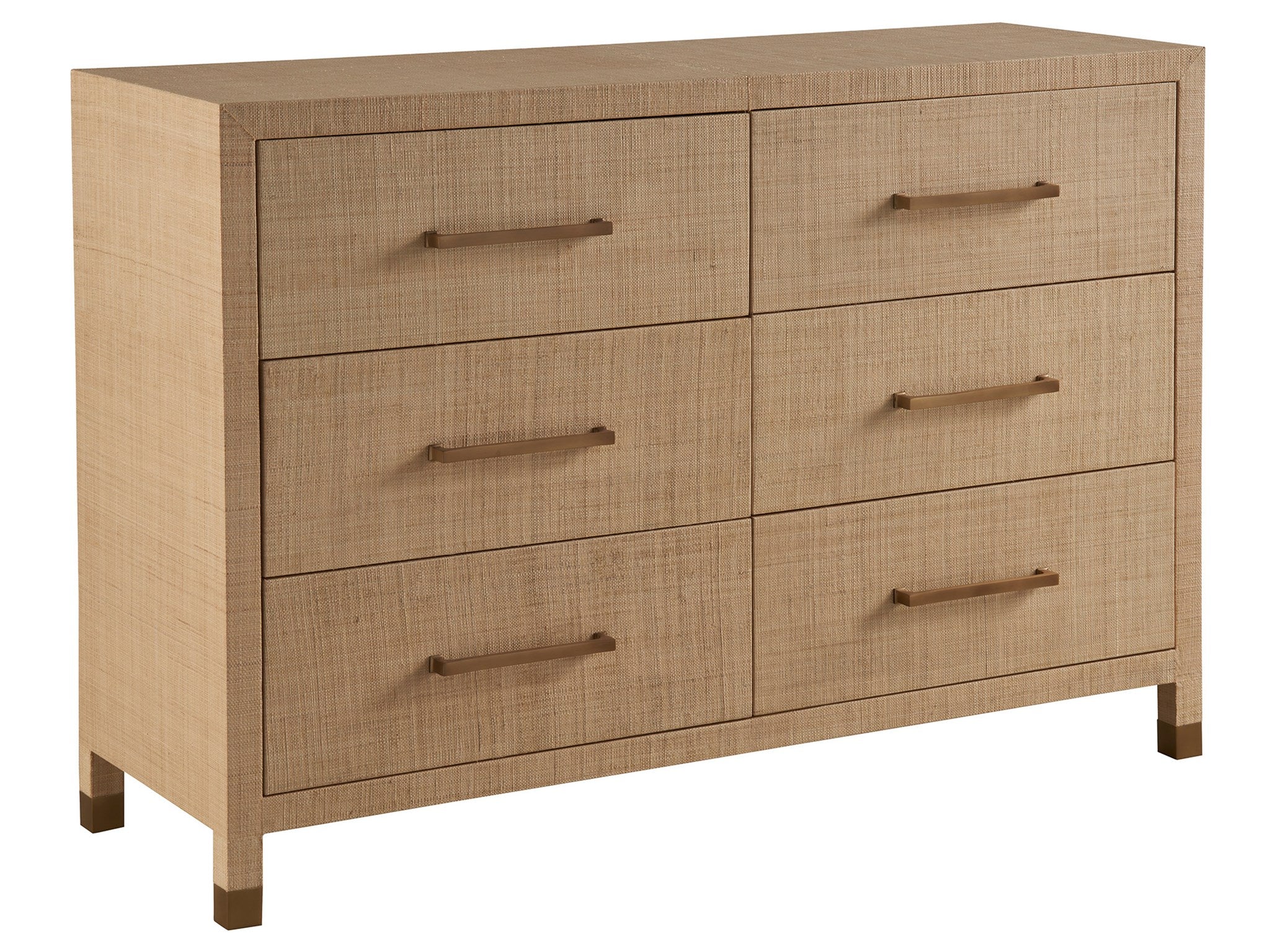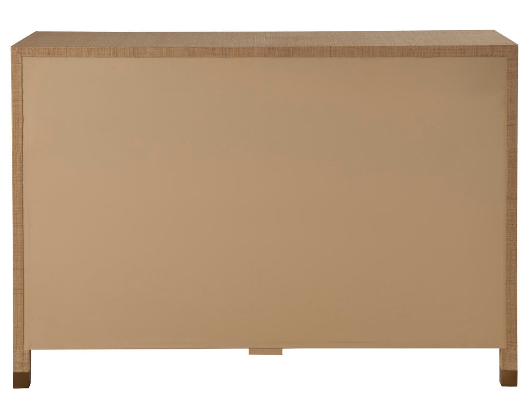 The Leah Dresser, featuring six drawers, is elegantly wrapped in raffia, presenting a textured and sophisticated appearance. Completed with bronzed bar hardware and leg accents, this piece elevates any space with its refined and distinctive charm, blending seamlessly into both modern and classic interiors.