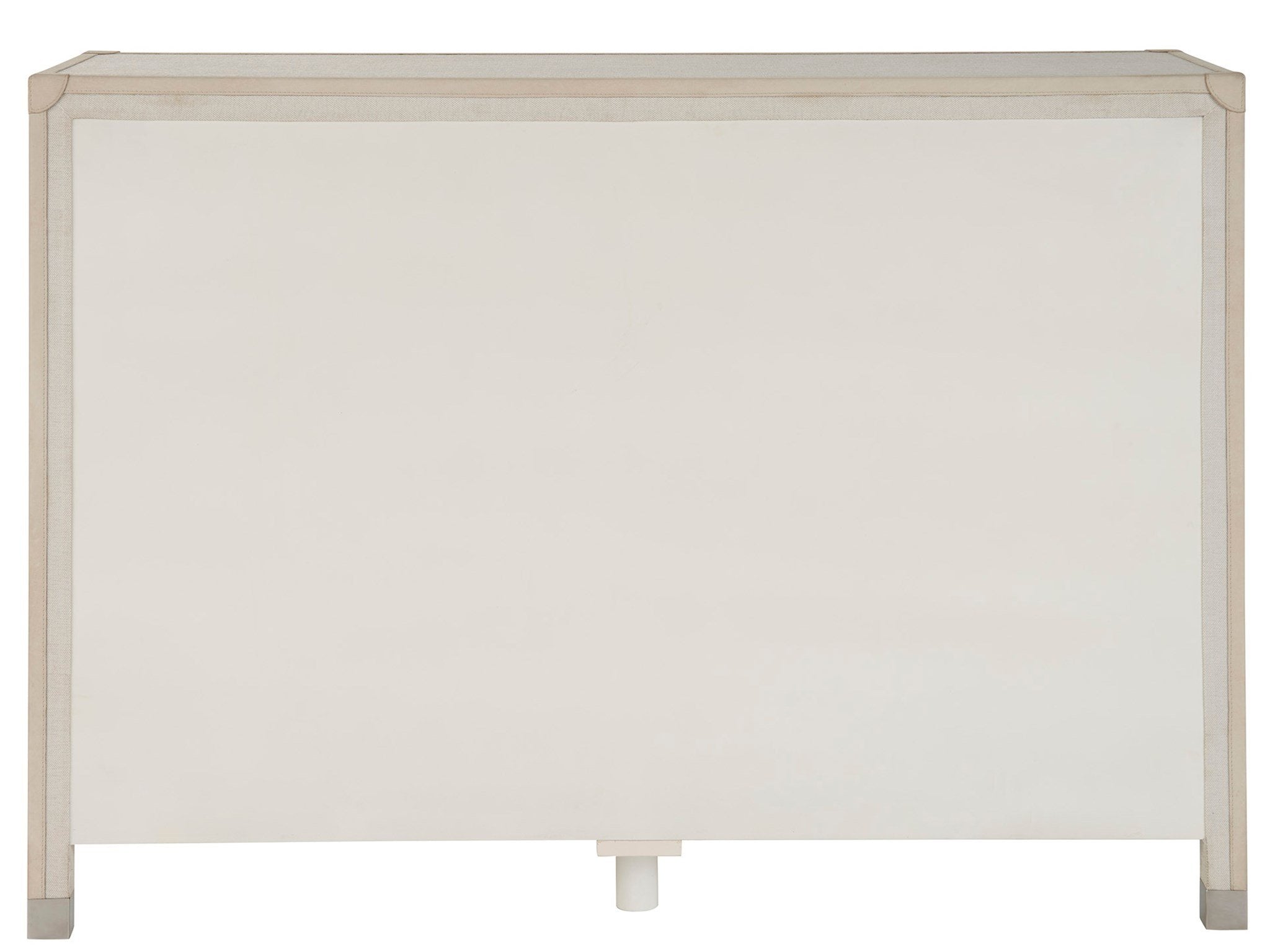 The Riven Dresser, with its three elongated drawers, is a masterpiece of textural harmony, brought to life by chic polished nickel ring pulls. Its body, wrapped in a sophisticated fabric, is elegantly highlighted by smooth leather trim, creating a captivating juxtaposition that marries softness with structure, embodying a refined aesthetic that is both visually and tactilely engaging.
