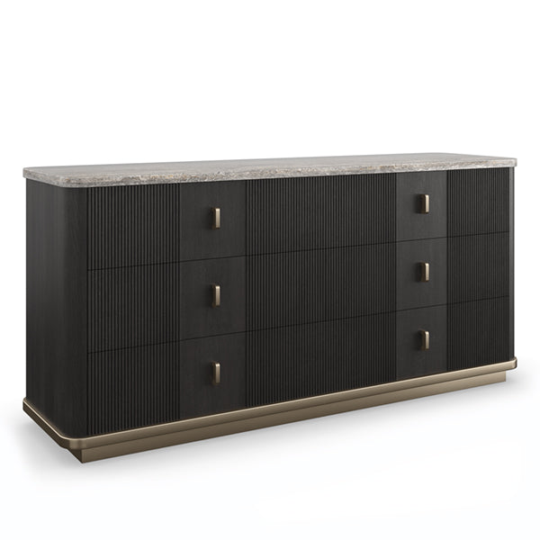 The natural beauty of travertine stone is punctuated by the visual rhythm of reeded drawer fronts in a Black Stained Ash finish. Rounded corners and bronze drawer pulls with a subtle contour soften its linear form and add a touch of warmth. Features six spacious drawers accentuated with bead molding and painted interiors for an added touch of luxe.