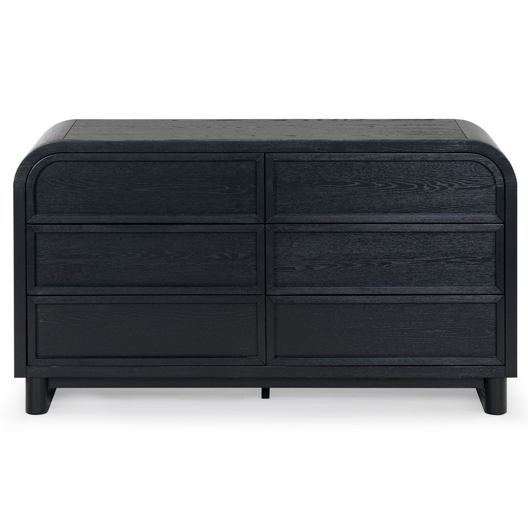 Introducing our exclusive DINAH 6 Drawer Wood Dresser in an elegant black finish. This sophisticated centrepiece stands out with its contemporary and stylish aesthetics. The fascinating fusion of solid rubberwood and oak veneer gives this dresser a distinctive edge that seamlessly merges with your home's d?cor. With six spacious drawers, your storage issues will become a thing of the past. Furthermore, its robust structure promises remarkable durability. Enhance the allure of your space with this exquisite piece that seamlessly blends utility and style. Our Dinah Dresser exemplifies design prowess while providing a practical solution to your storage needs. Transform your rooms into an oasis of order and elegance with this chic dresser.