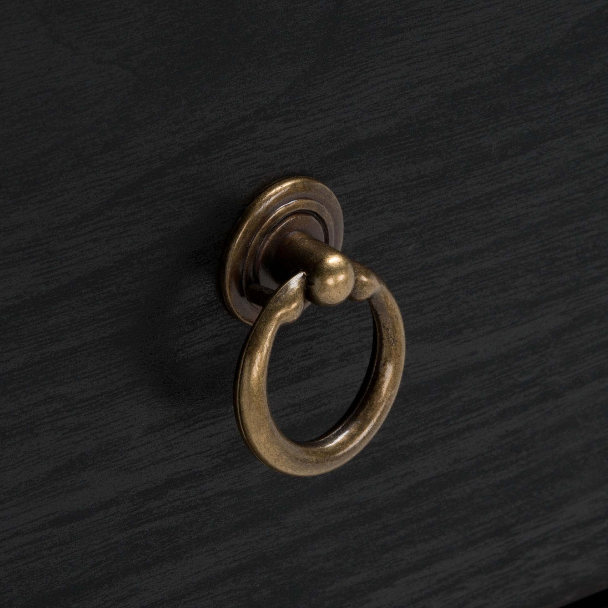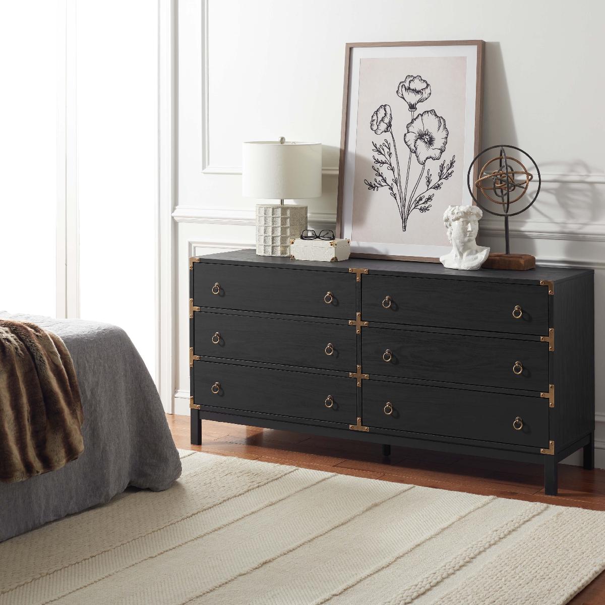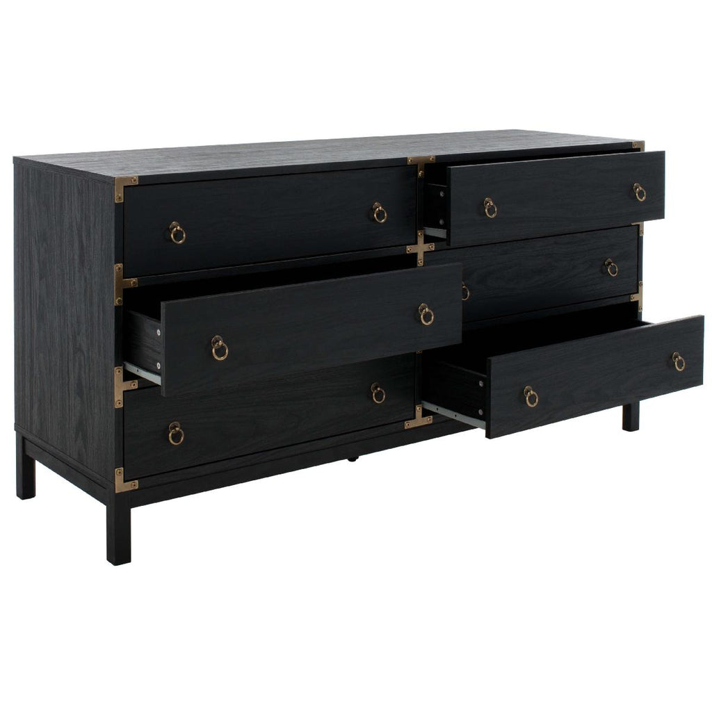 Keep your home organized and clutter-free with our charming and spacious Galio chest. Thoughtfully streamlined, the crisp and clean lines of our chest boast timeless aesthetics. It is gracefully perched and adorns a rich black veneer to enliven your home. Being inspired by the effortless beauty of vintage style, our chest is finished off with ring pulls and gold hardware on the edges. An elegant and timeless addition, the chest includes 6 drawers to store and organize all your clothing, linens, and accessories.