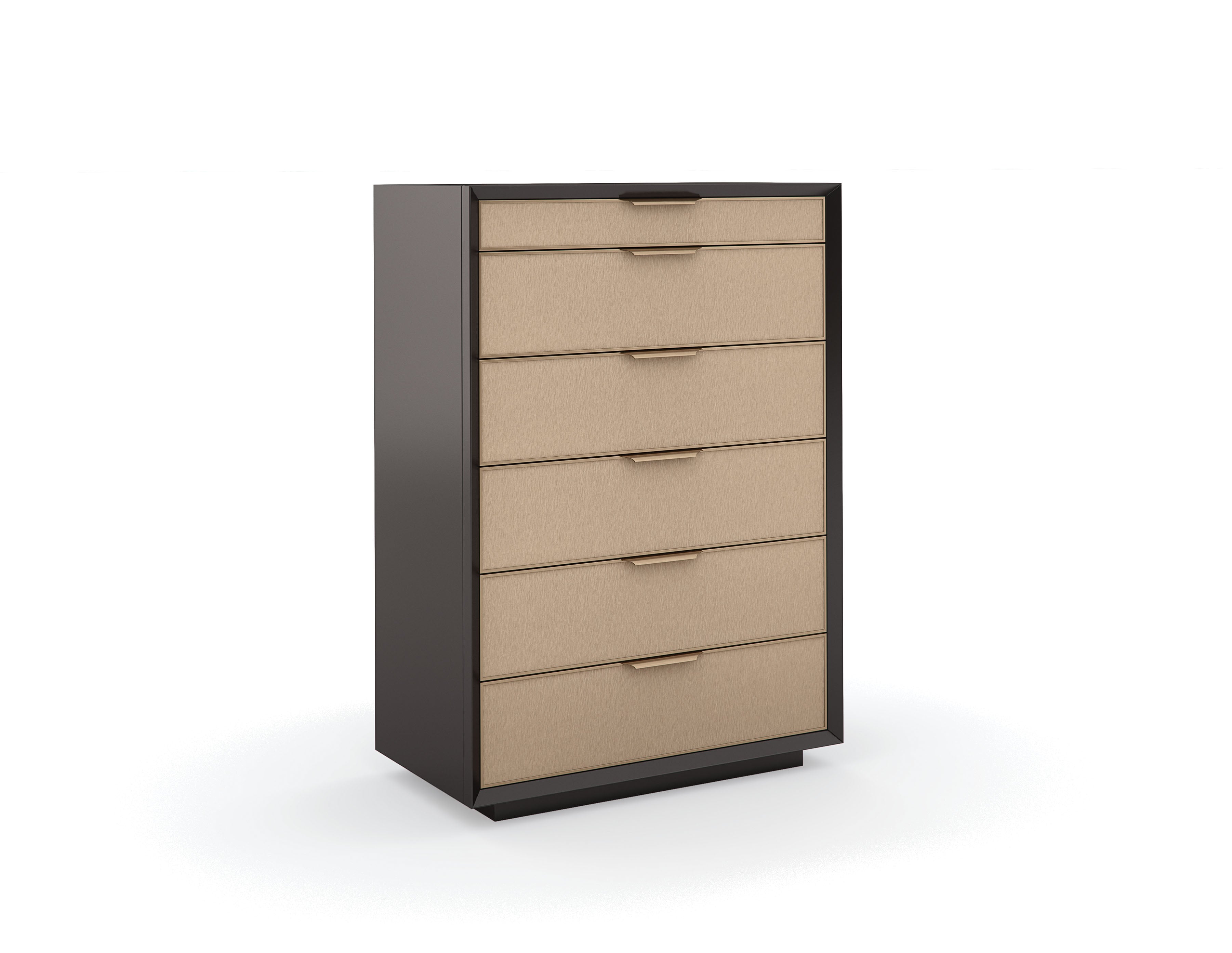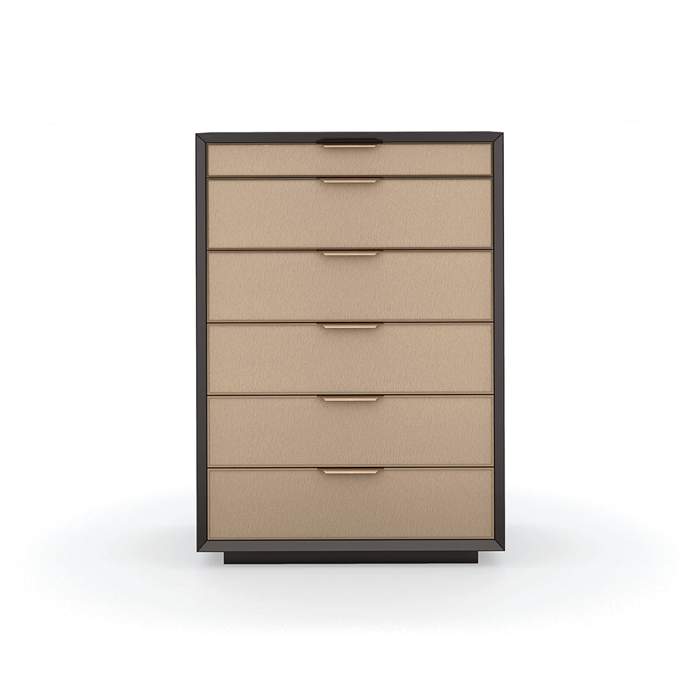 Introduce a sophisticated style to bedroom interiors with this architectural-inspired dresser, merging minimalism with elements of mid-century modern. Each drawer front is wrapped in a beautifully textured vinyl, embossed with a rivulet pattern like rain trickling down a windowpane. Metal trim in Champagne Gold artfully incorporates rounded pulls to seamlessly frame each drawer, designed to open and close with ease. A felt-lined top drawer is perfect for organizing cufflinks and jewelry.