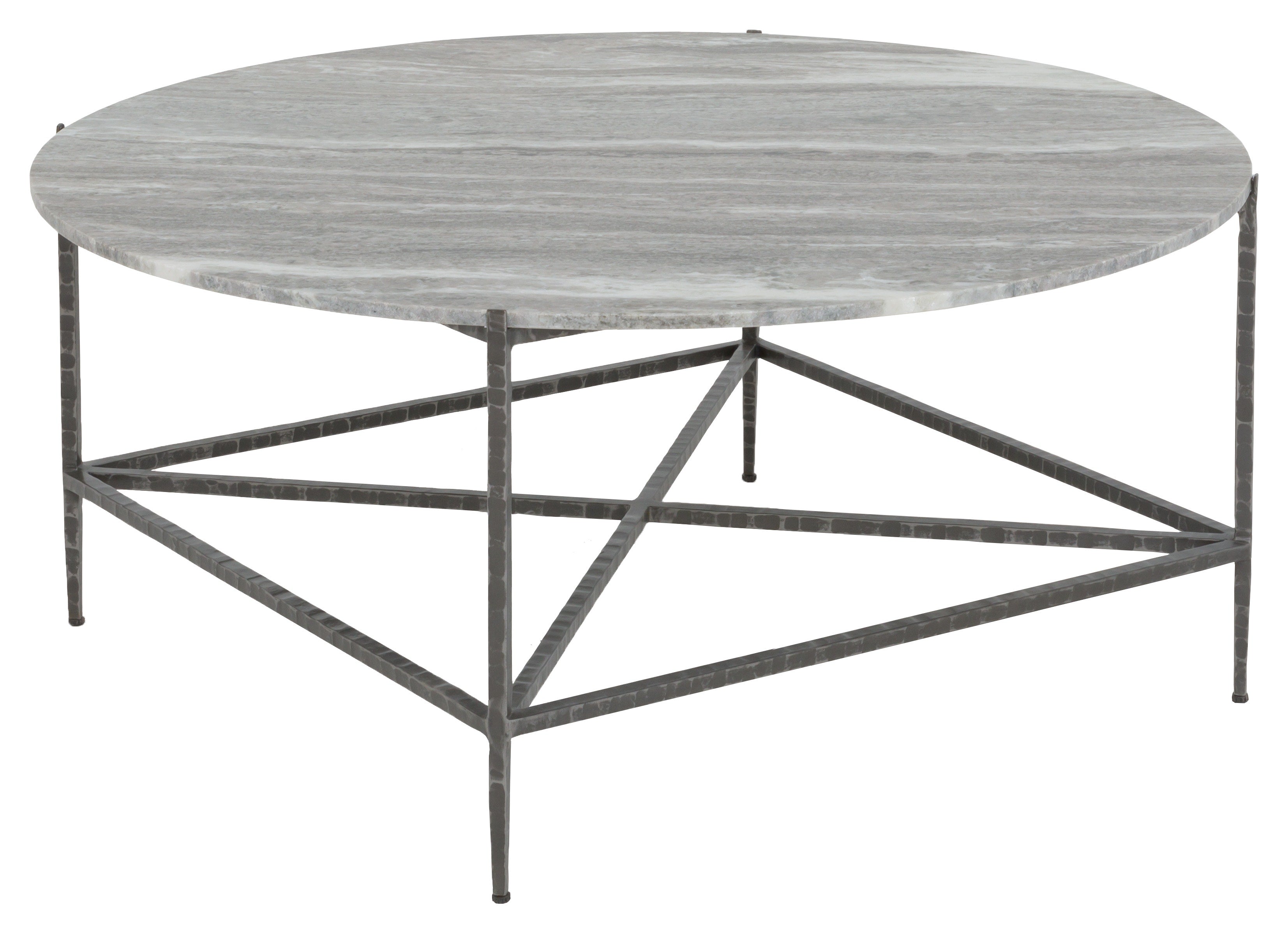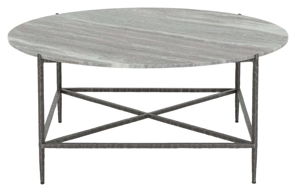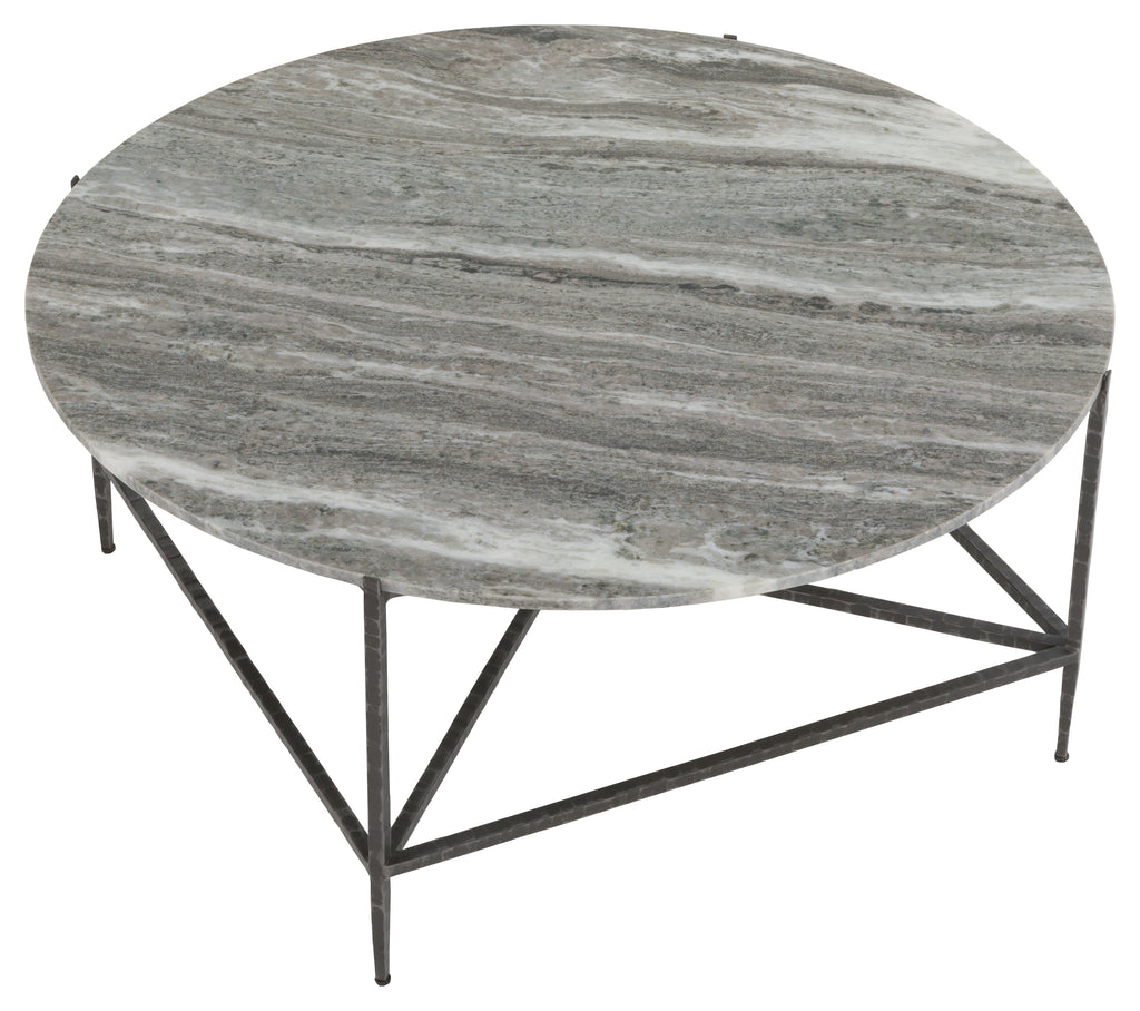 Featuring a hammered metal base topped with a grey and brown honed marble, our Axel tables are the perfect bridge between form & function. Creating visual interest, these clean-lined silhouettes are softened by round or semi-oval tops, crafted in all-natural marble. Axel is offered as a 42" round cocktail table, 52" wide console table and a 23" high drink table.