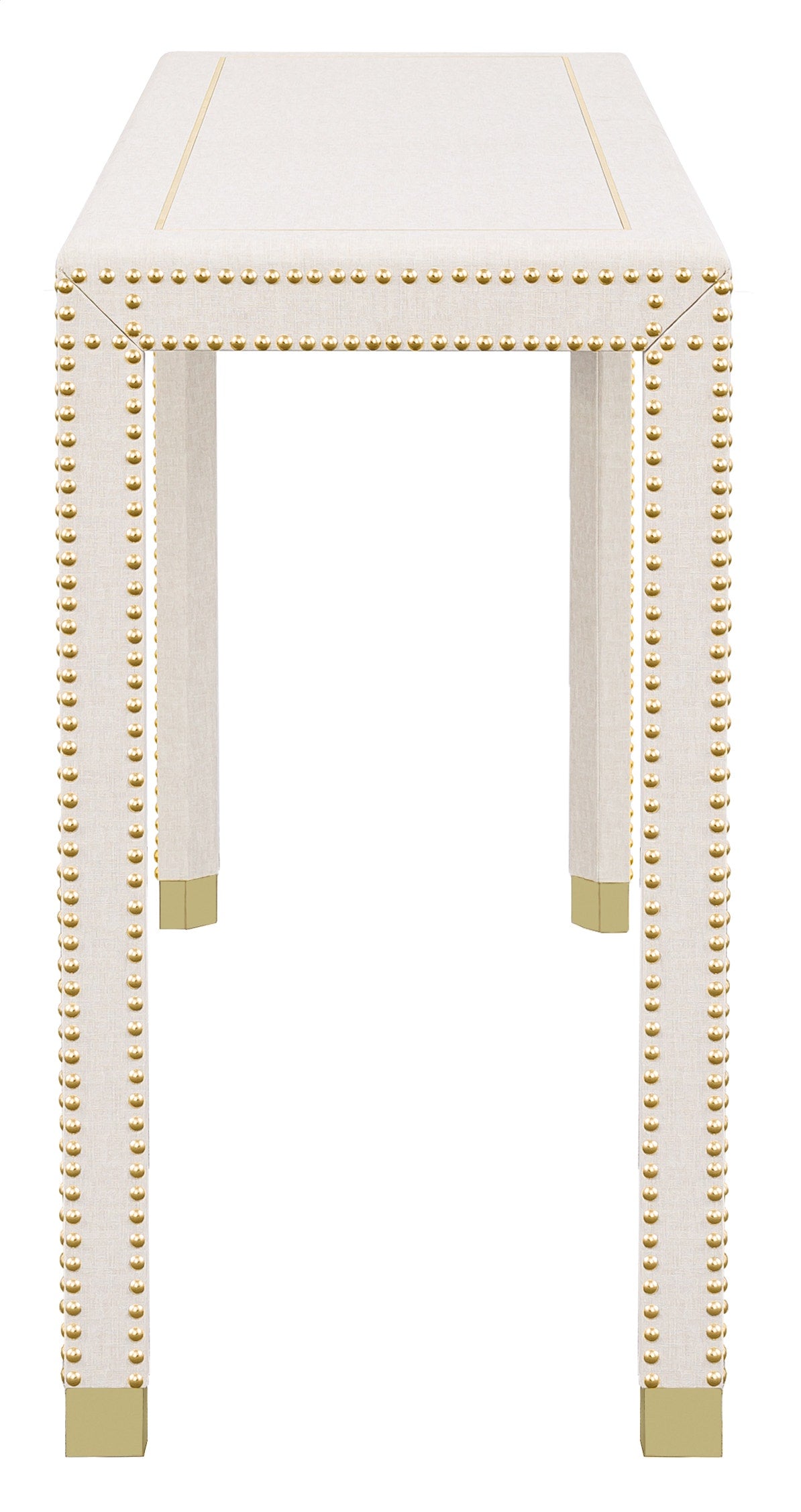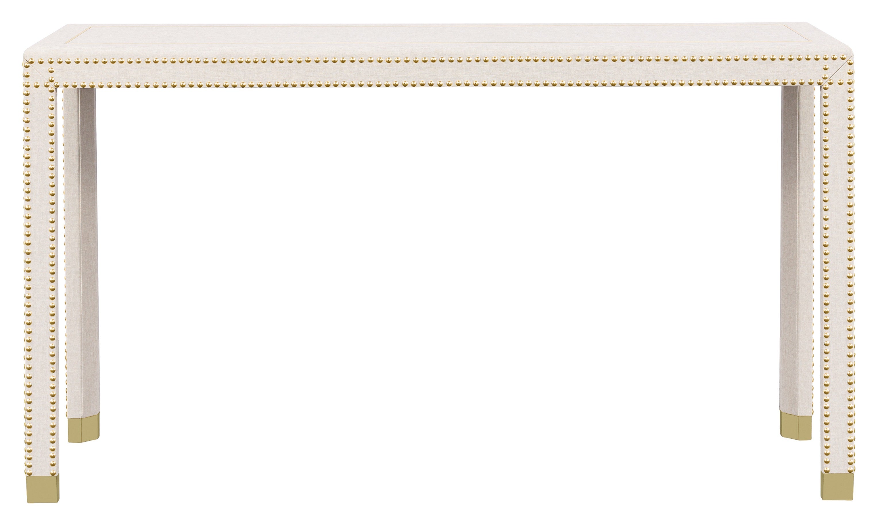 Our Beverly upholstered console tables are the perfect tables to be used at the end of a hallway,for display, or behind a sofa. Upholstered in a very durable faux leather with pebbled texture. Each table is outlined with nailhead trim, metal ferrules and an inset metal border on the table tops. Store your favorite pouf underneath these tables for additional seating.