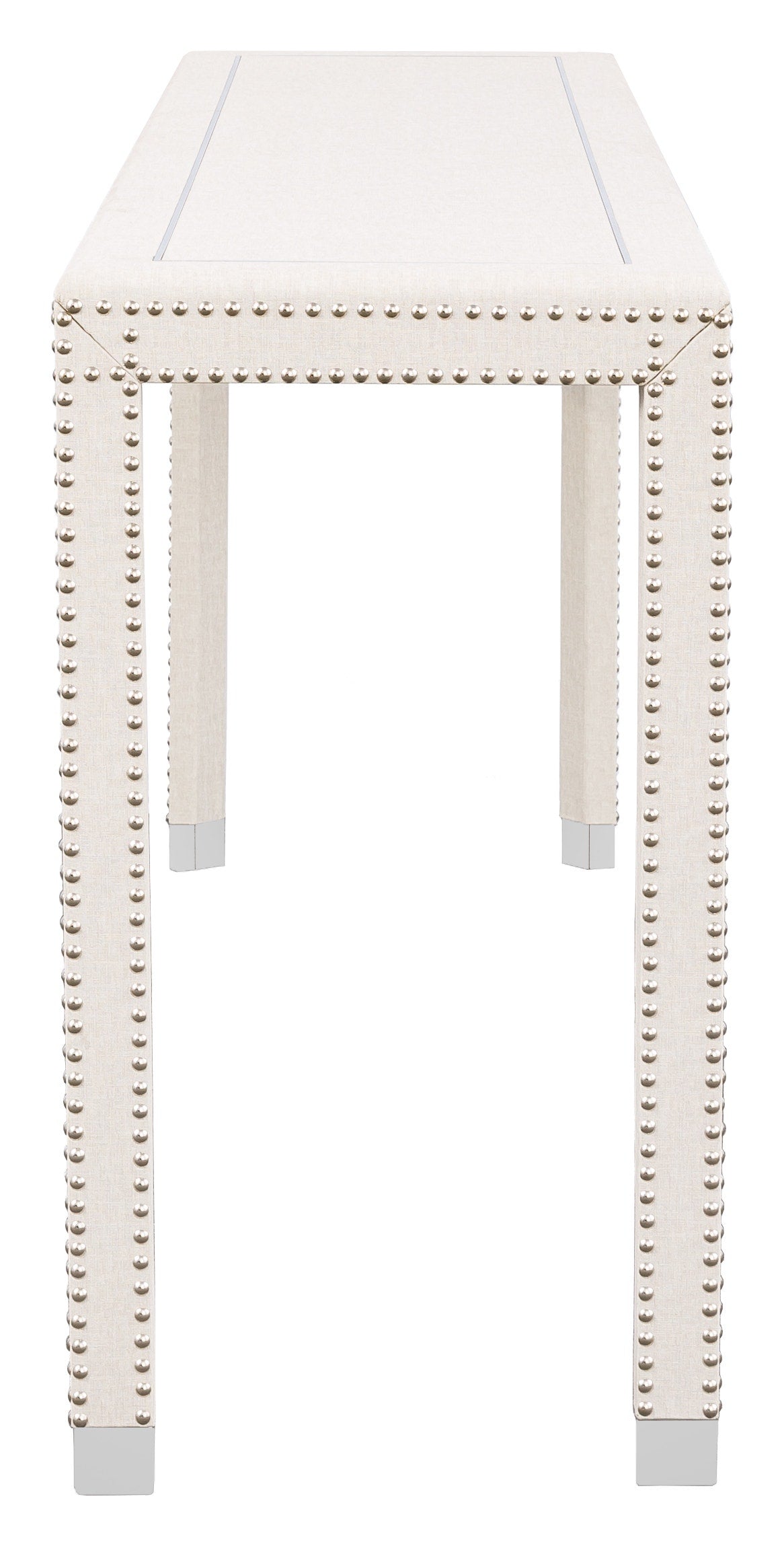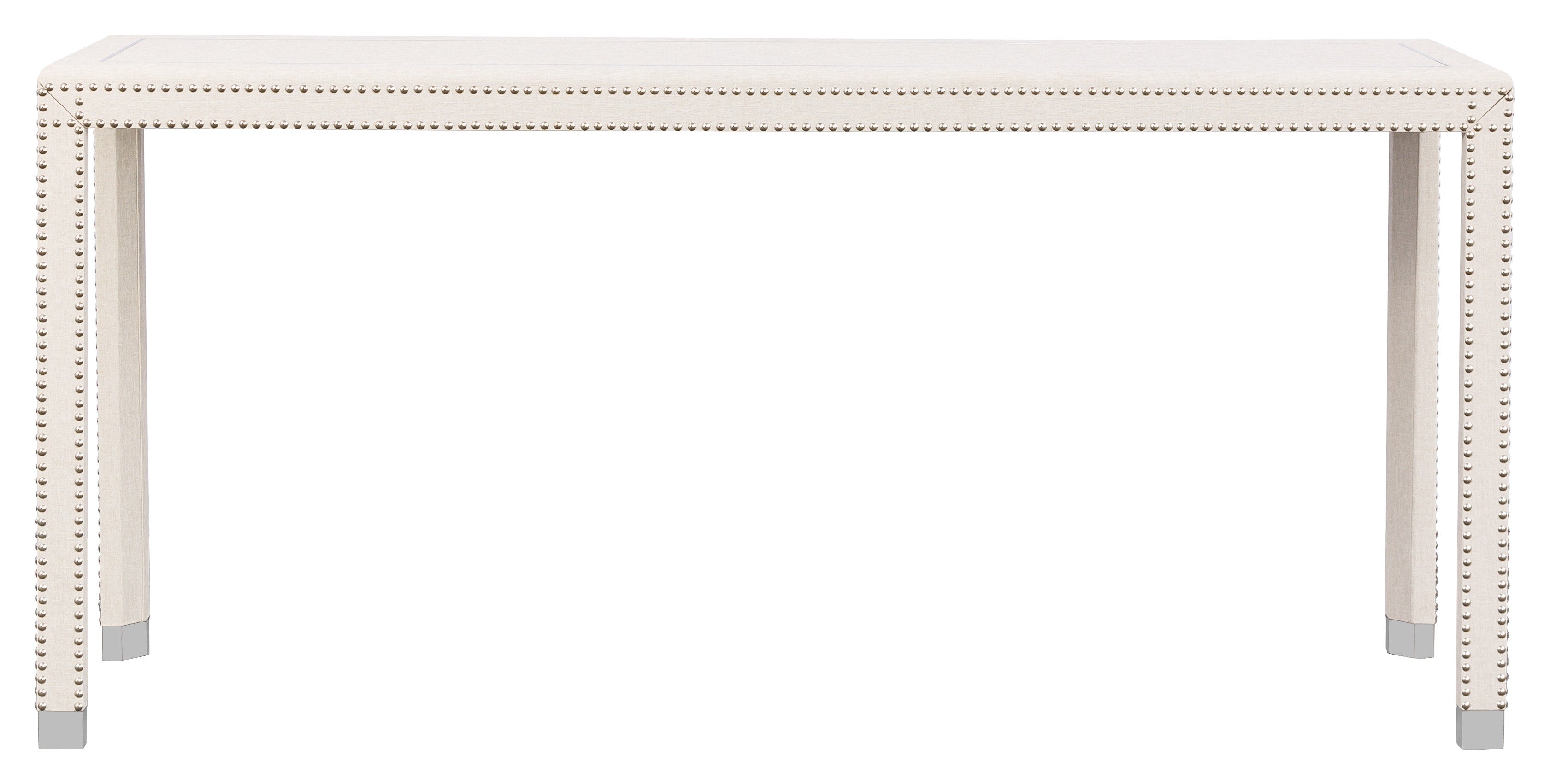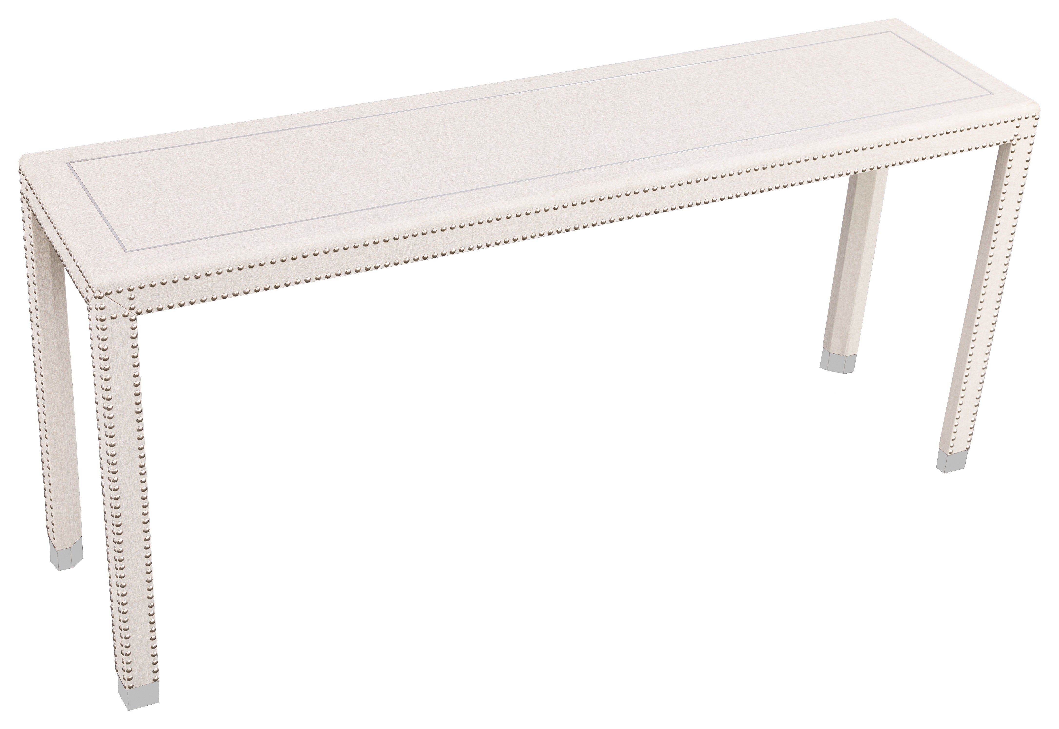Our Beverly upholstered console tables are the perfect tables to be used at the end of a hallway,for display, or behind a sofa. Upholstered in a very durable faux leather with pebbled texture. Each table is outlined with nailhead trim, metal ferrules and an inset metal border on the table tops. Store your favorite pouf underneath these tables for additional seating.