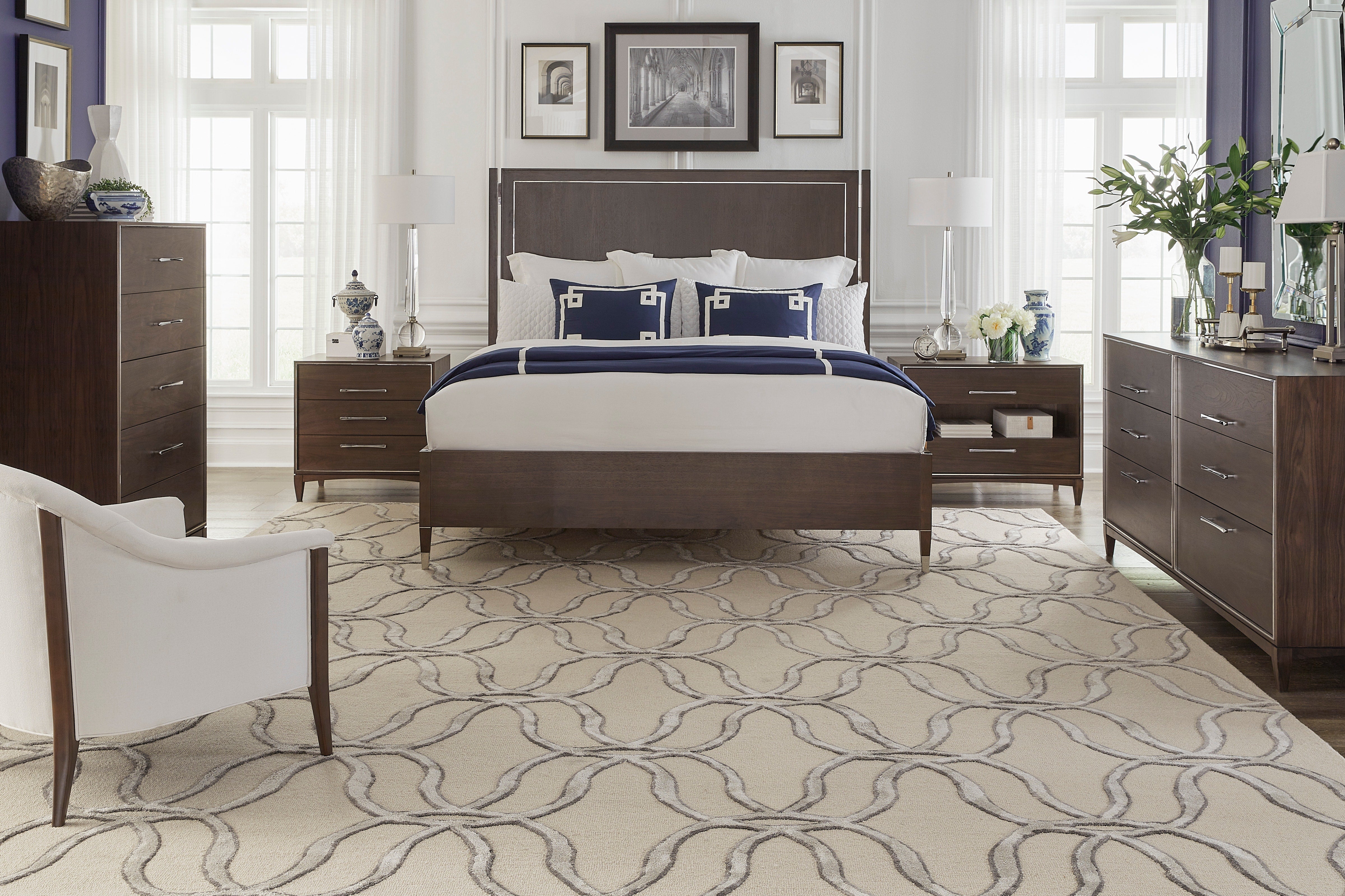 The Farley King/Queen Bed is a striking walnut wood paneled bed in the Sheer Dove gray finish with polished nickel details and is the standout star of this bedroom collection. The headboard is made up of vertical panels, which allow you to appreciate the gorgeous grain of the wood, and the combination of the polished nickel spacers that connect the outer frame to the inner frame, along with the polished nickel bead trim, give this bed an elegance and simplicity that can work in many different design styles. The foot rail and side rails are also in the beautiful walnut wood and the legs are finished with polished nickel Ferrule's for a little touch of brightness.