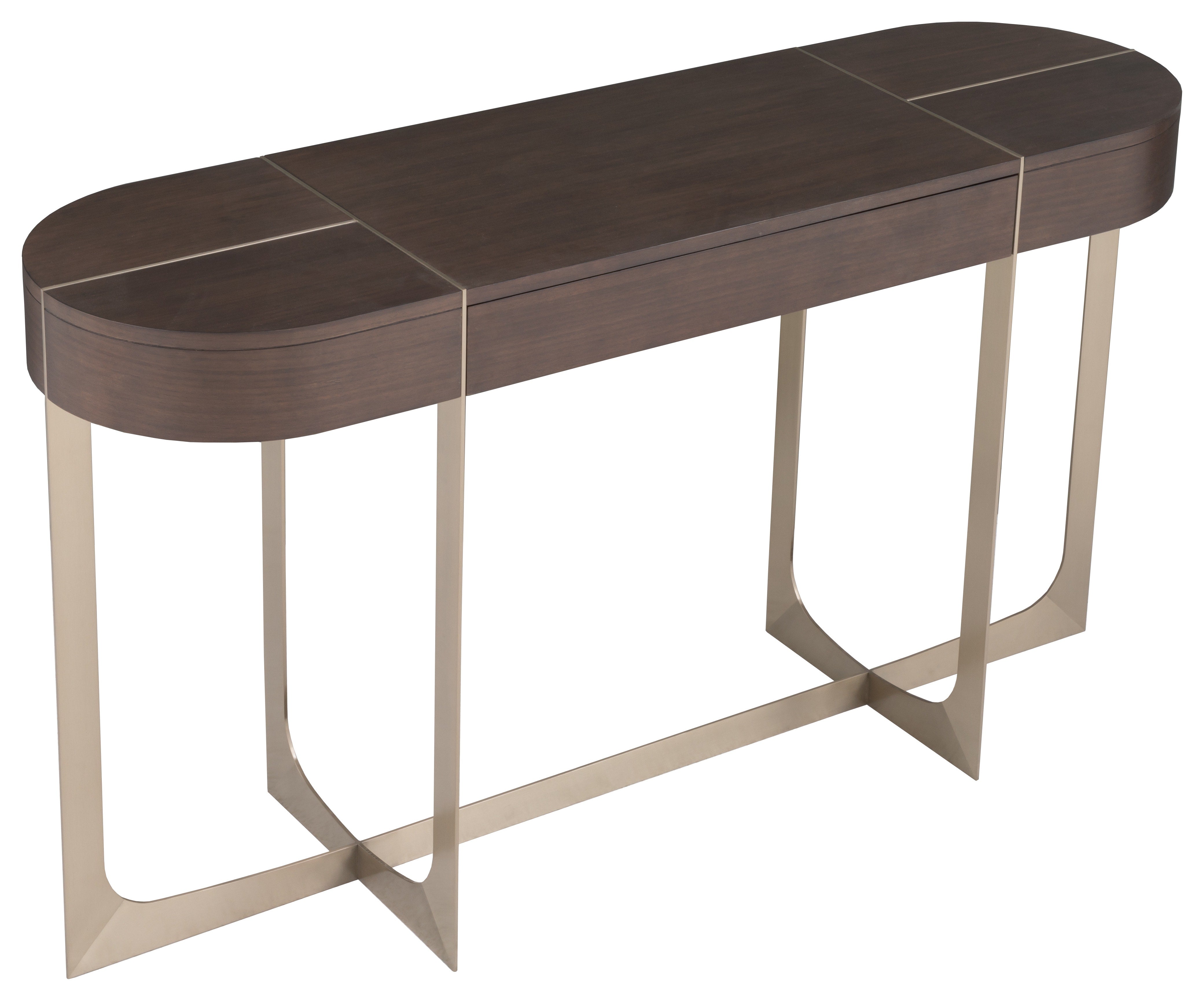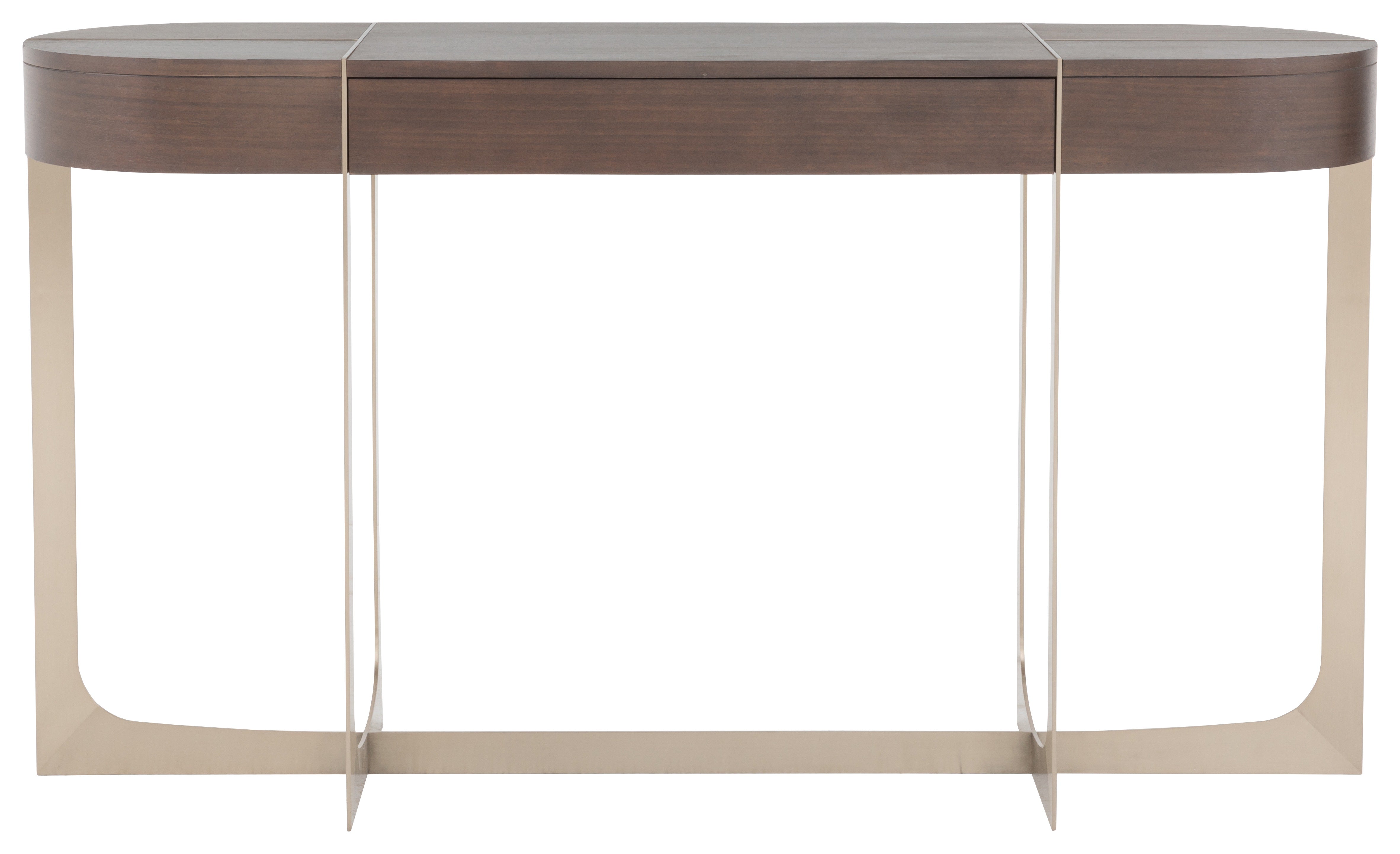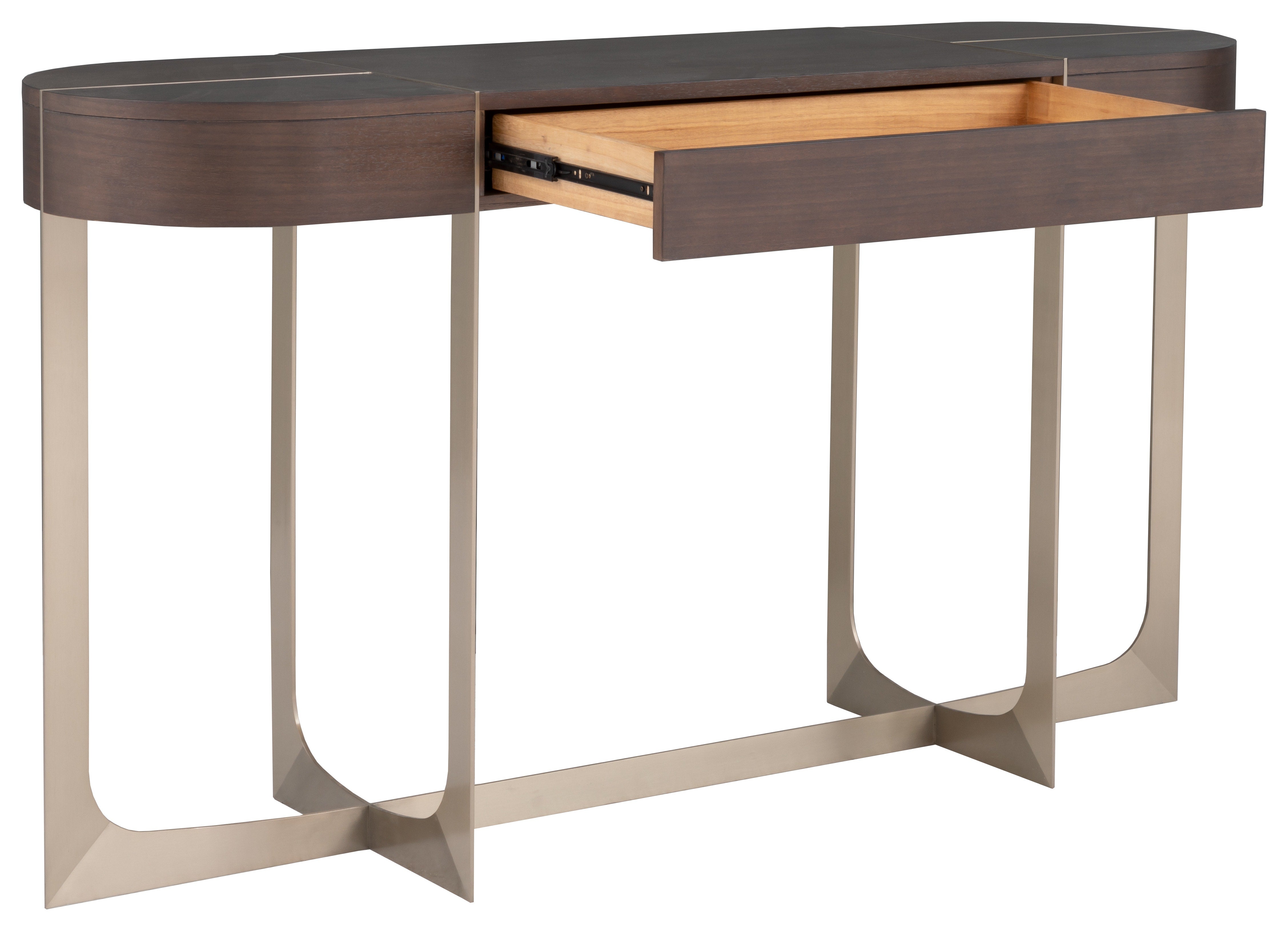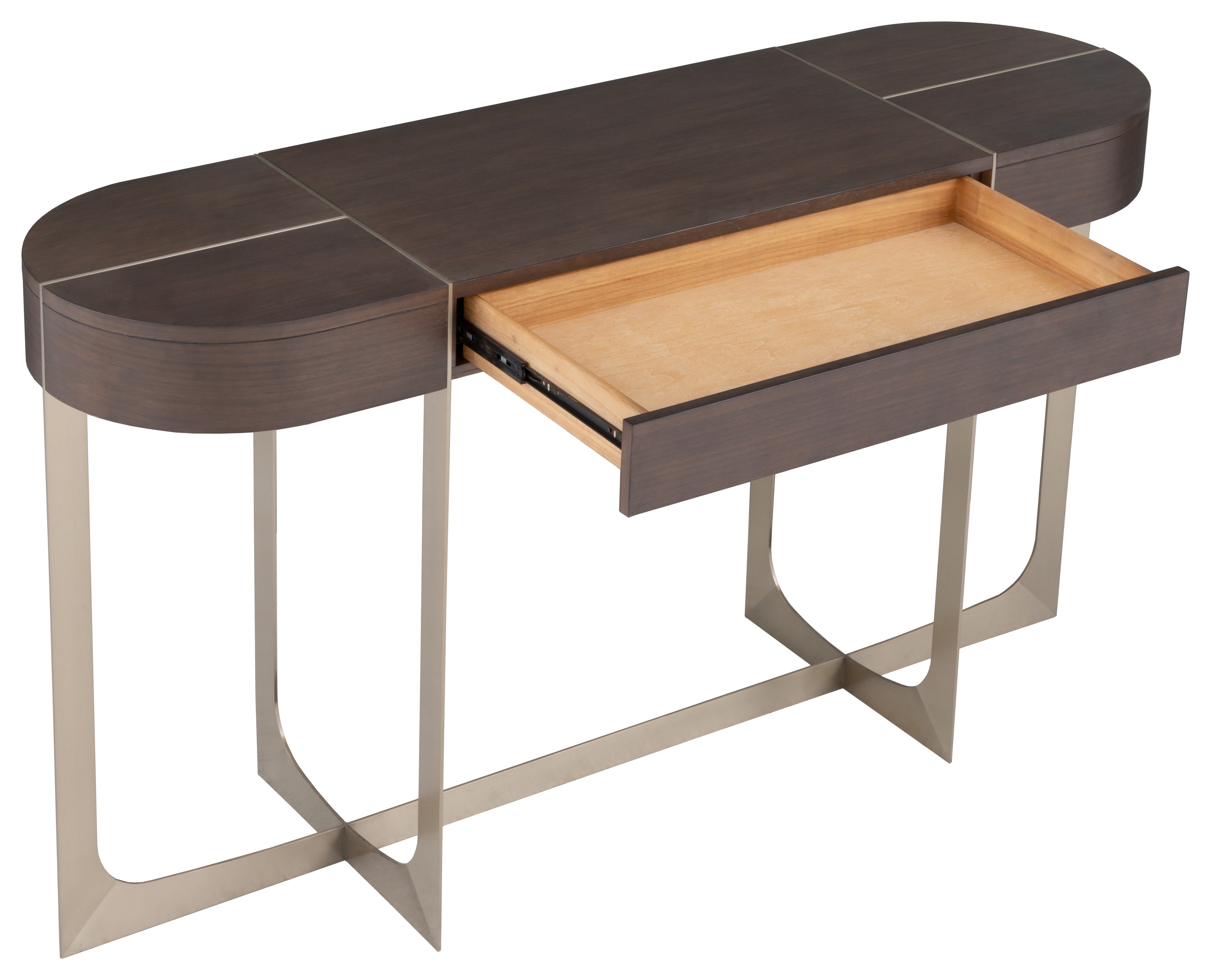 Sleek and stylish, the Goddard oval console table is classic yet contemporary, the eucalyptus veneer really shines in the rich smoked stone wood finish. The subtle and slight brushed champagne brass details add interest to the top while the metal takes an interesting shape to form the legs and the base. A hidden drawer adds functionality but doesn't have hardware so the metal inlay detail at the top really shines.
