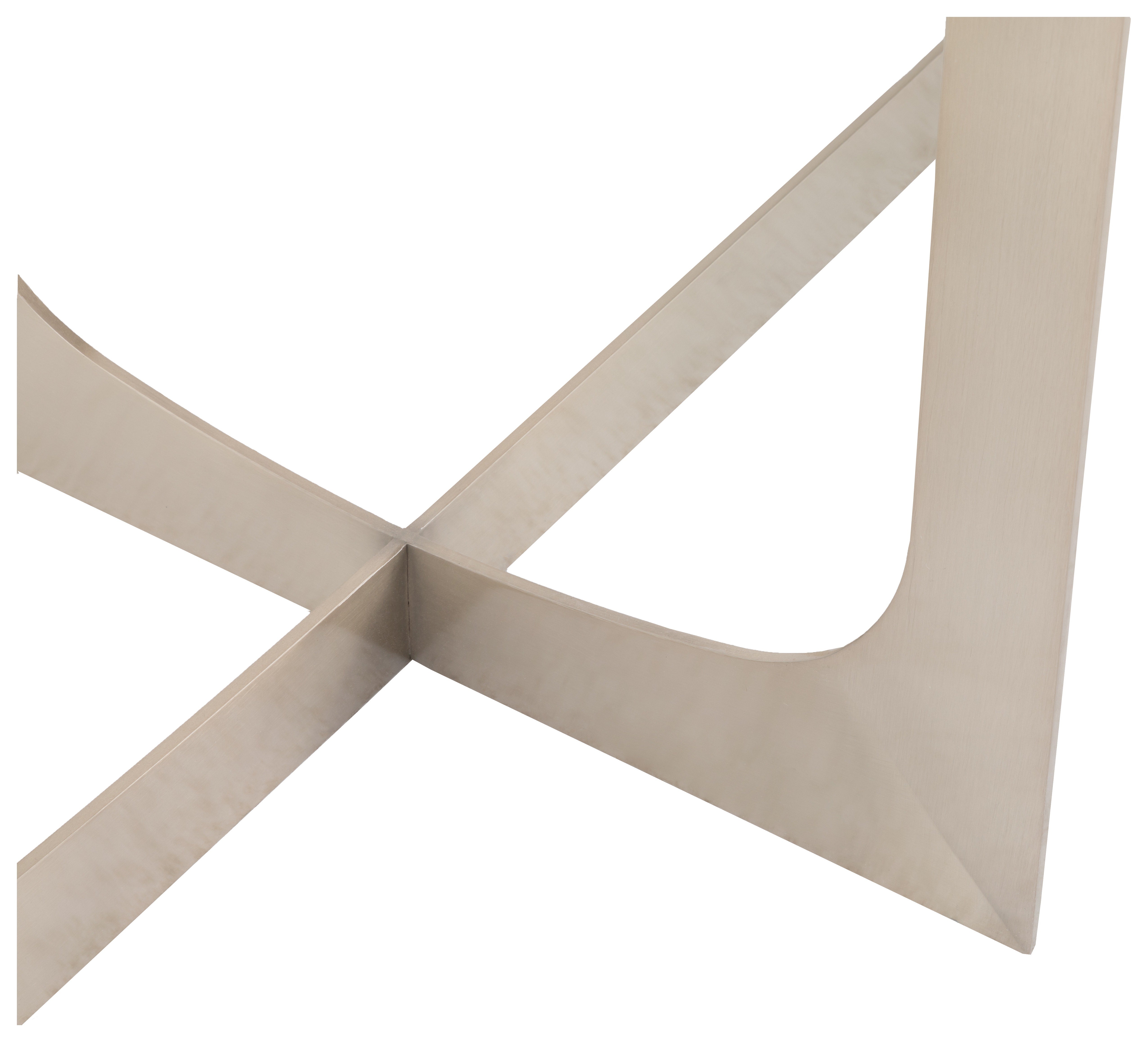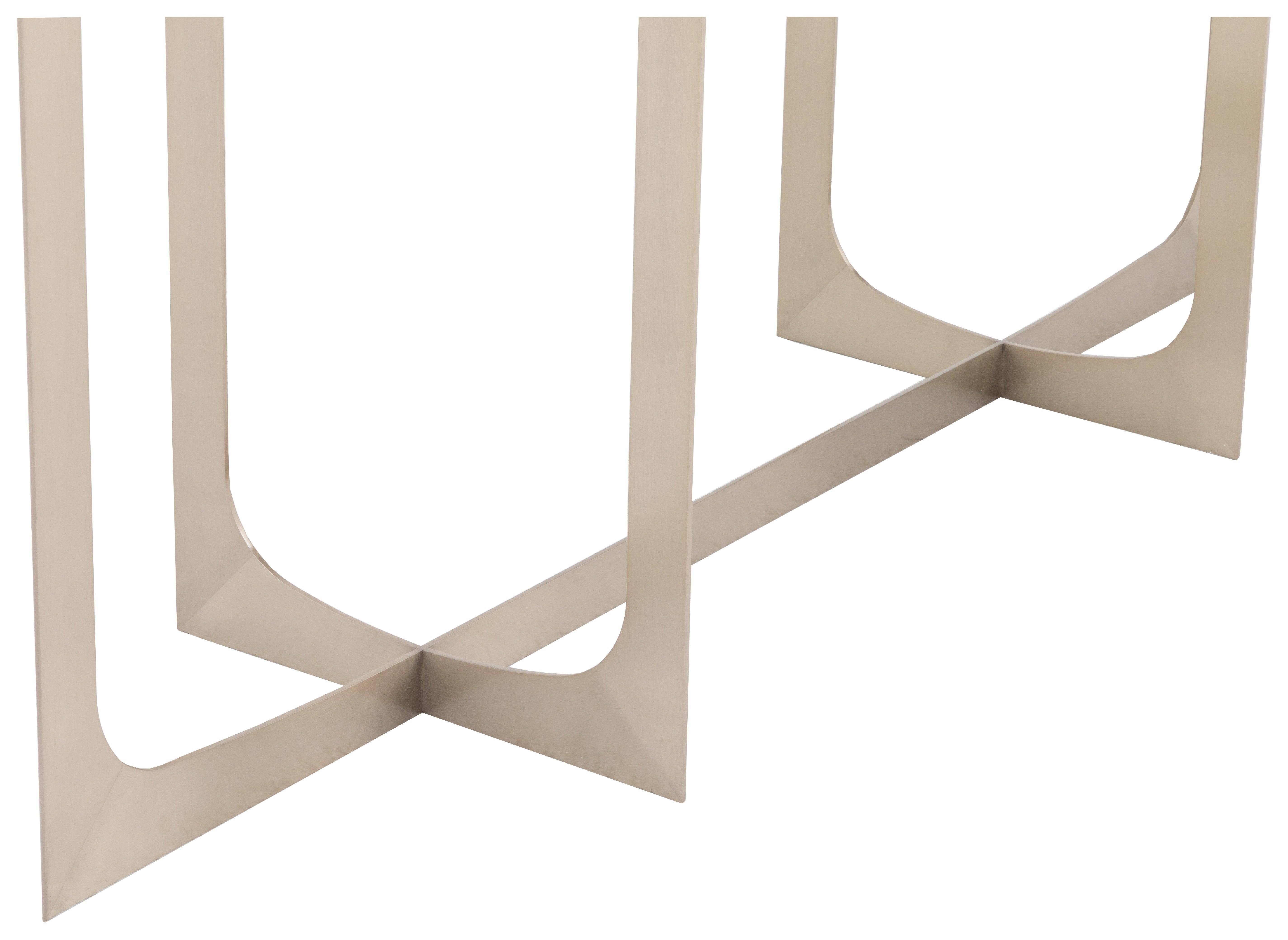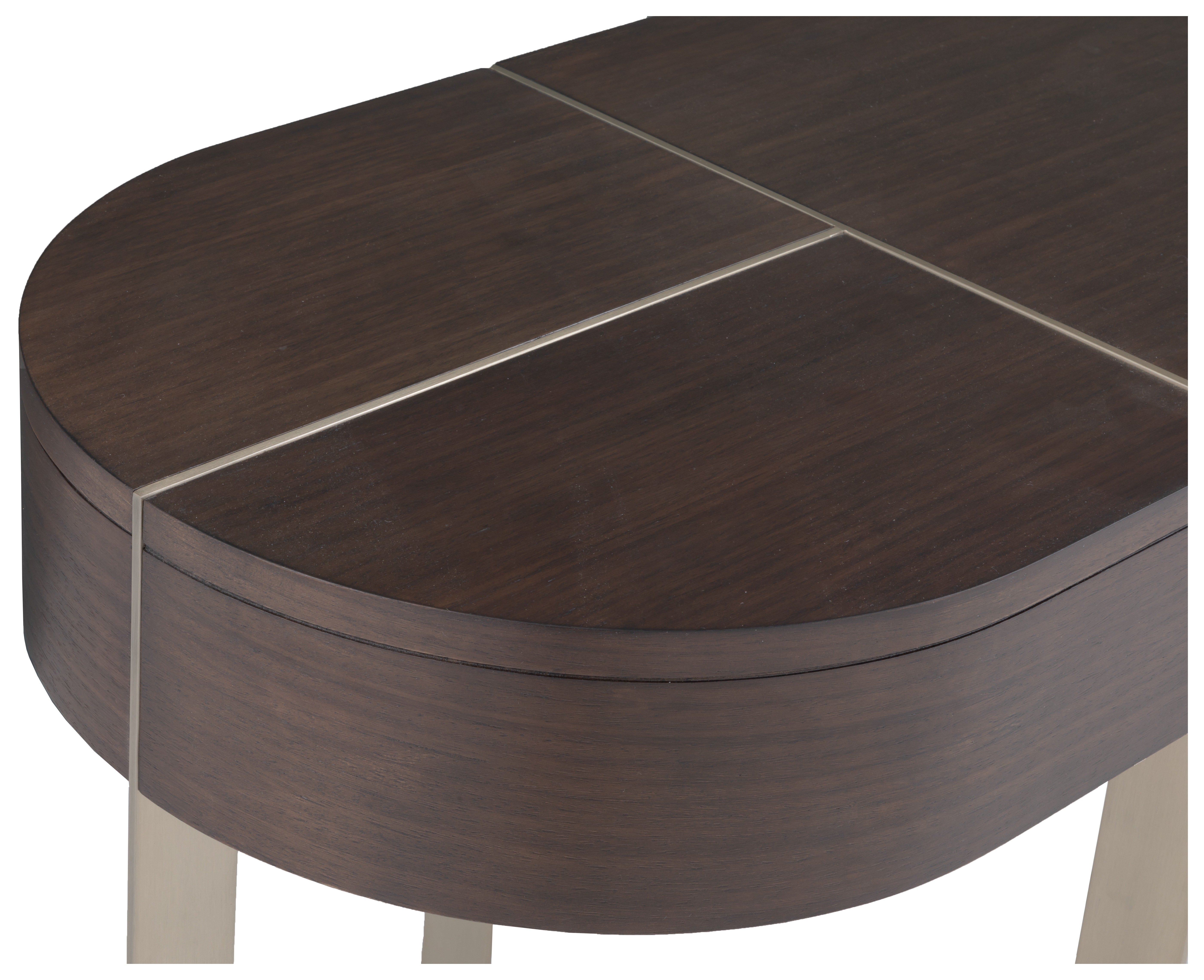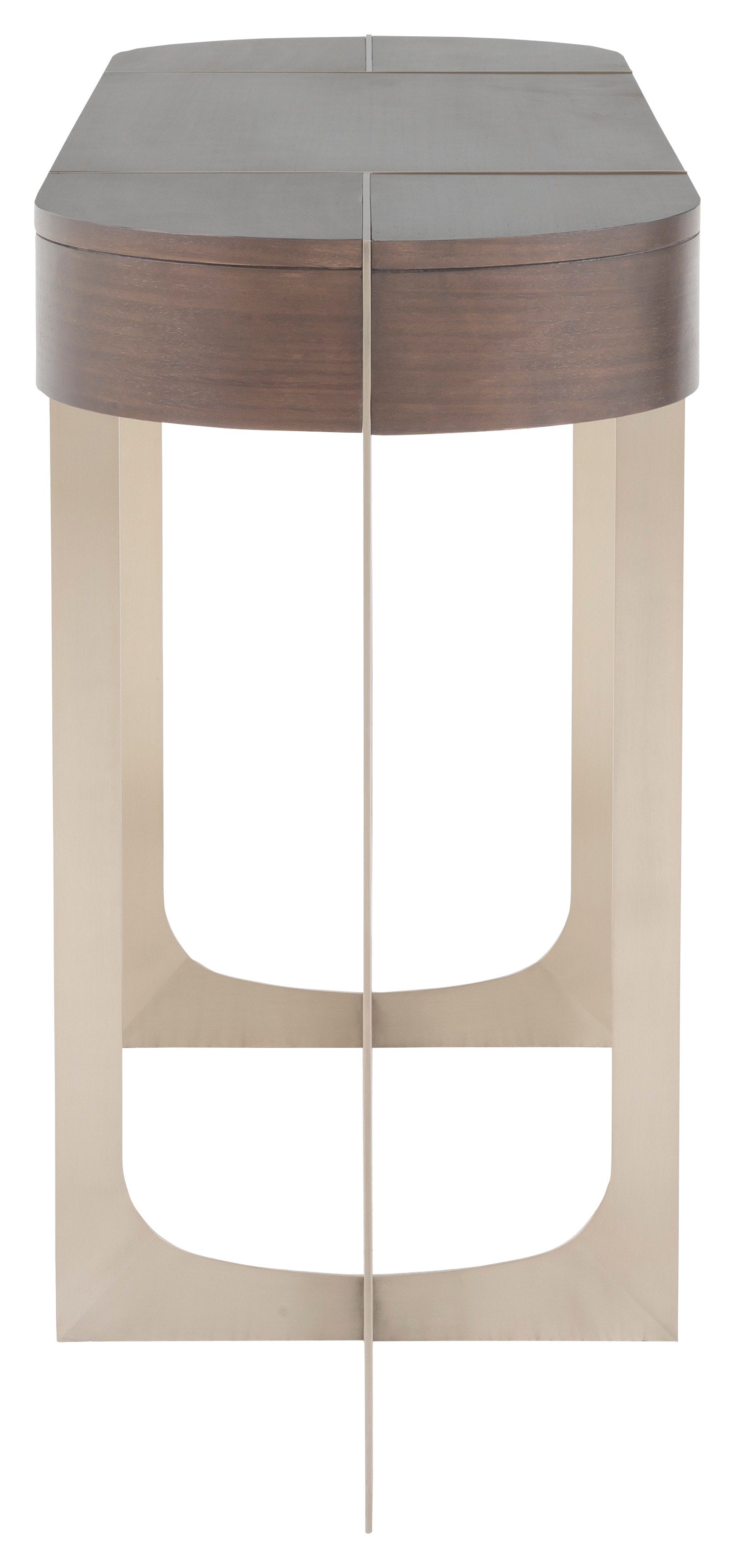 Sleek and stylish, the Goddard oval console table is classic yet contemporary, the eucalyptus veneer really shines in the rich smoked stone wood finish. The subtle and slight brushed champagne brass details add interest to the top while the metal takes an interesting shape to form the legs and the base. A hidden drawer adds functionality but doesn't have hardware so the metal inlay detail at the top really shines.