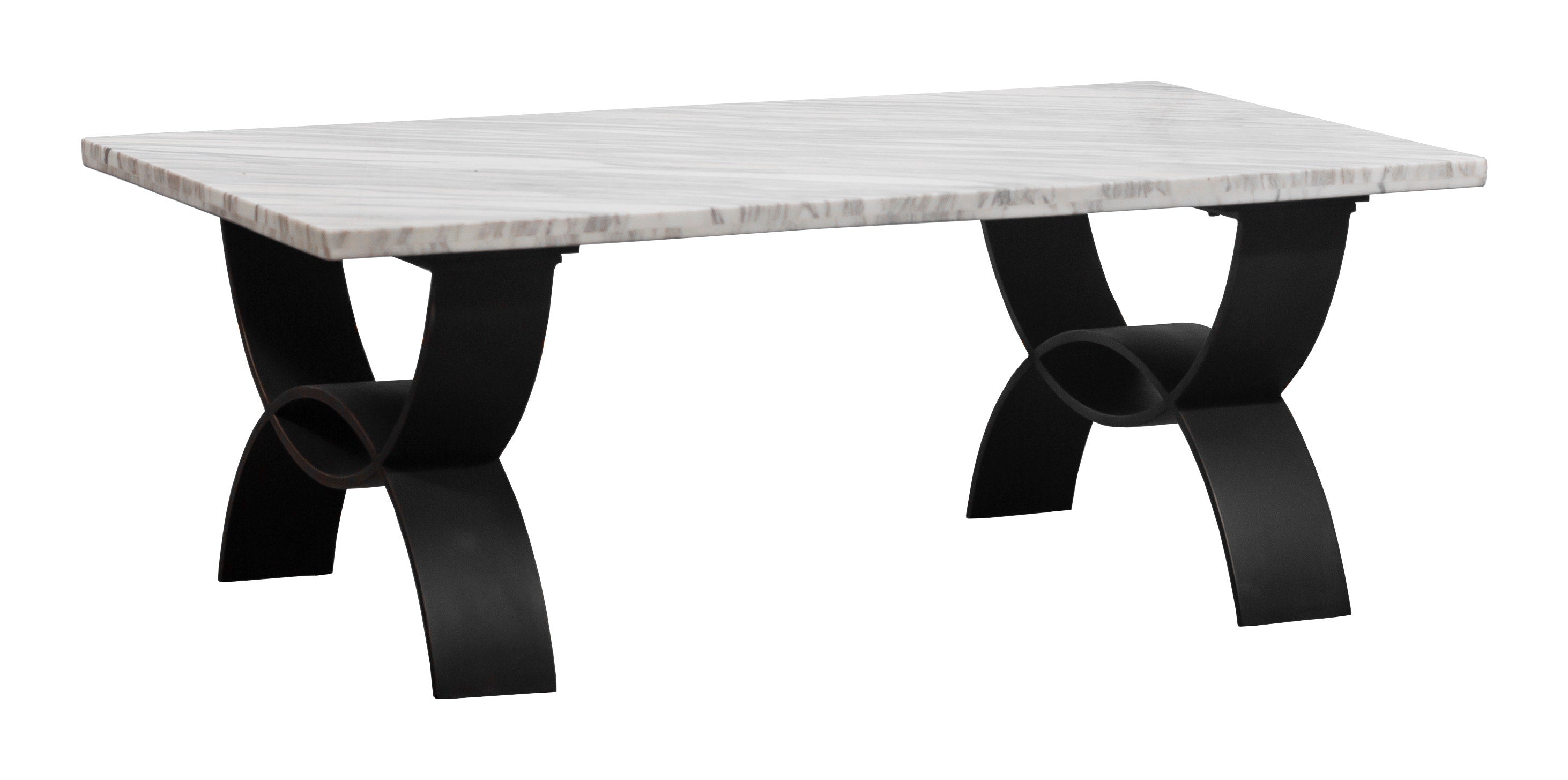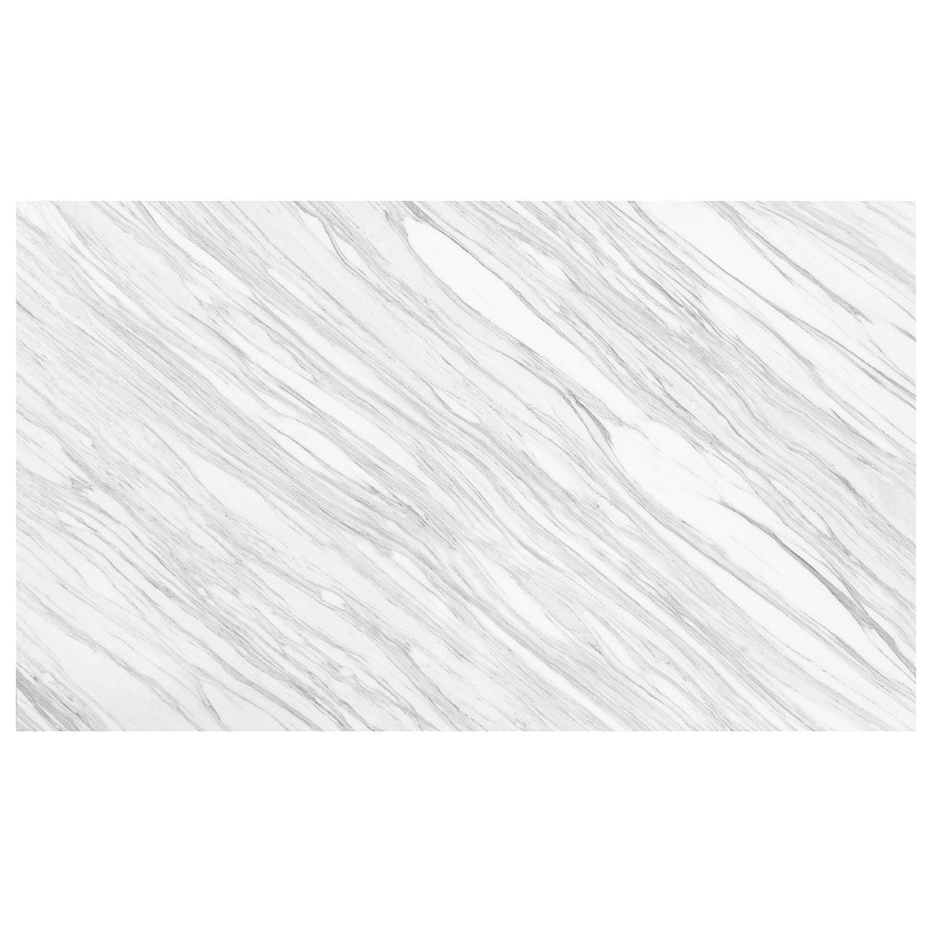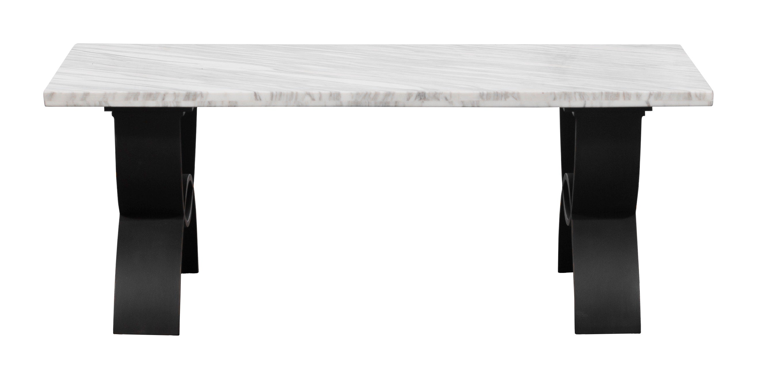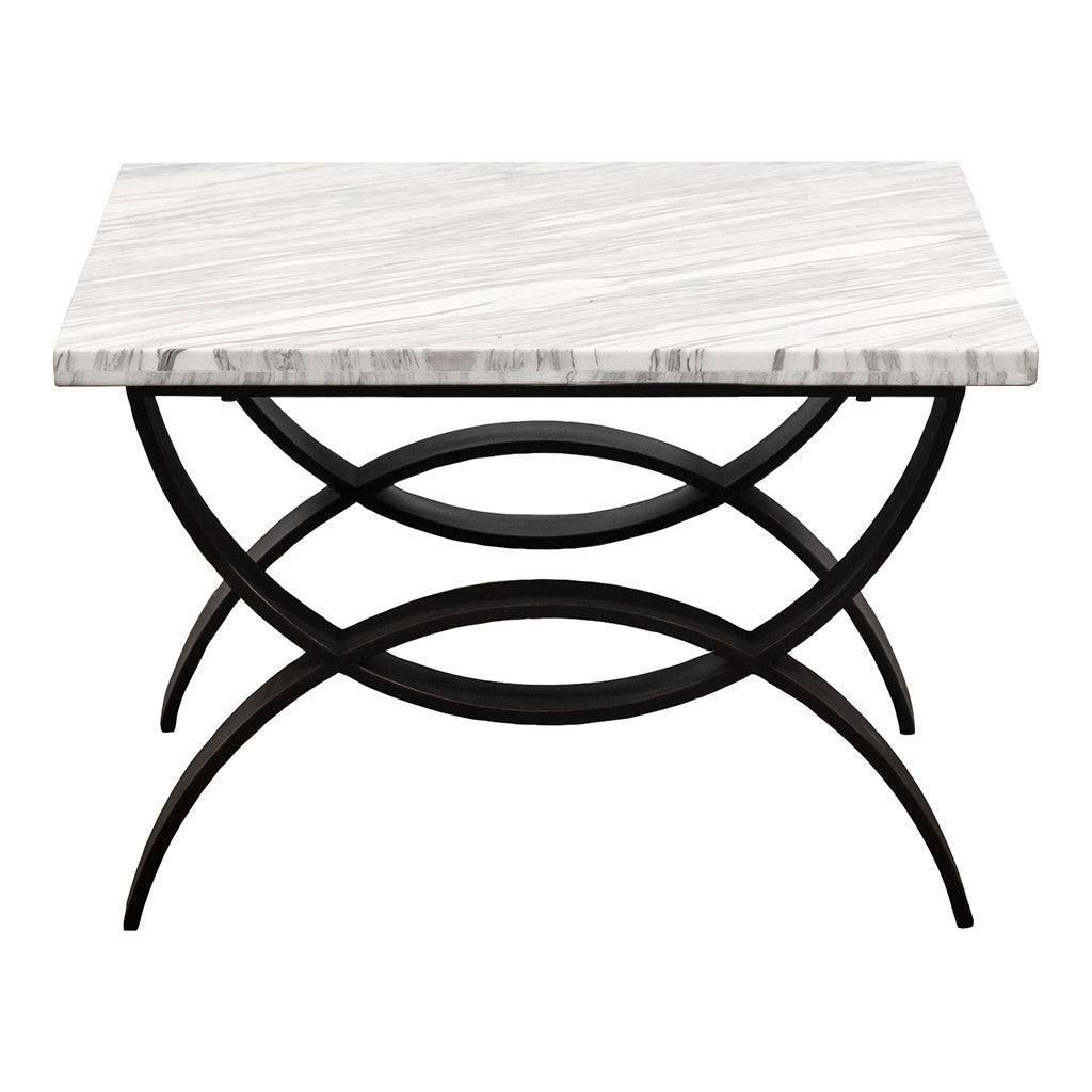 An architectural statement piece with a generous width and depth, Millstone features an intersecting, half-round metal base with a gray and white Calcutta marble top.