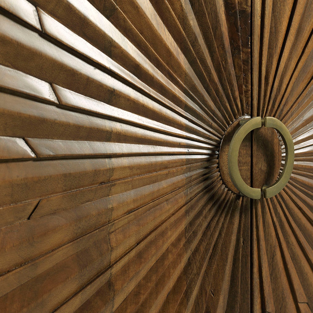 An intricately crafted collection of dining pieces, St. Florian silhouettes showcase hand-applied inlaid designs of various woods on the tabletops and drawer fronts. Finished in a Charred Ecru, the vivid marquetry design elements are complimented by natural brass details.