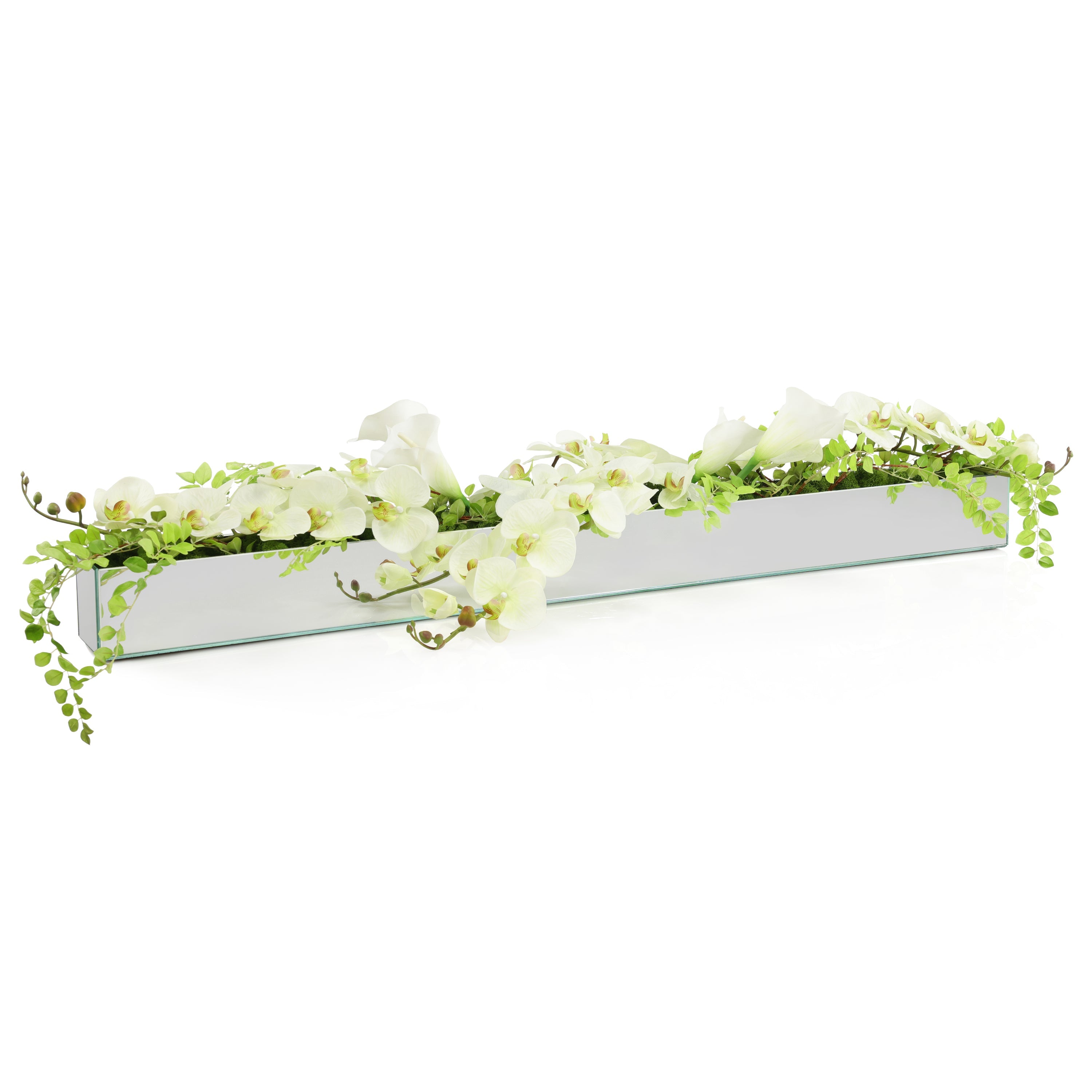 Orchid Trellis is a stunning floral arrangement with an aspine spray, light green orchids, and white calla lilies displayed from a rectangular, mirrored container lined with green reindeer moss.