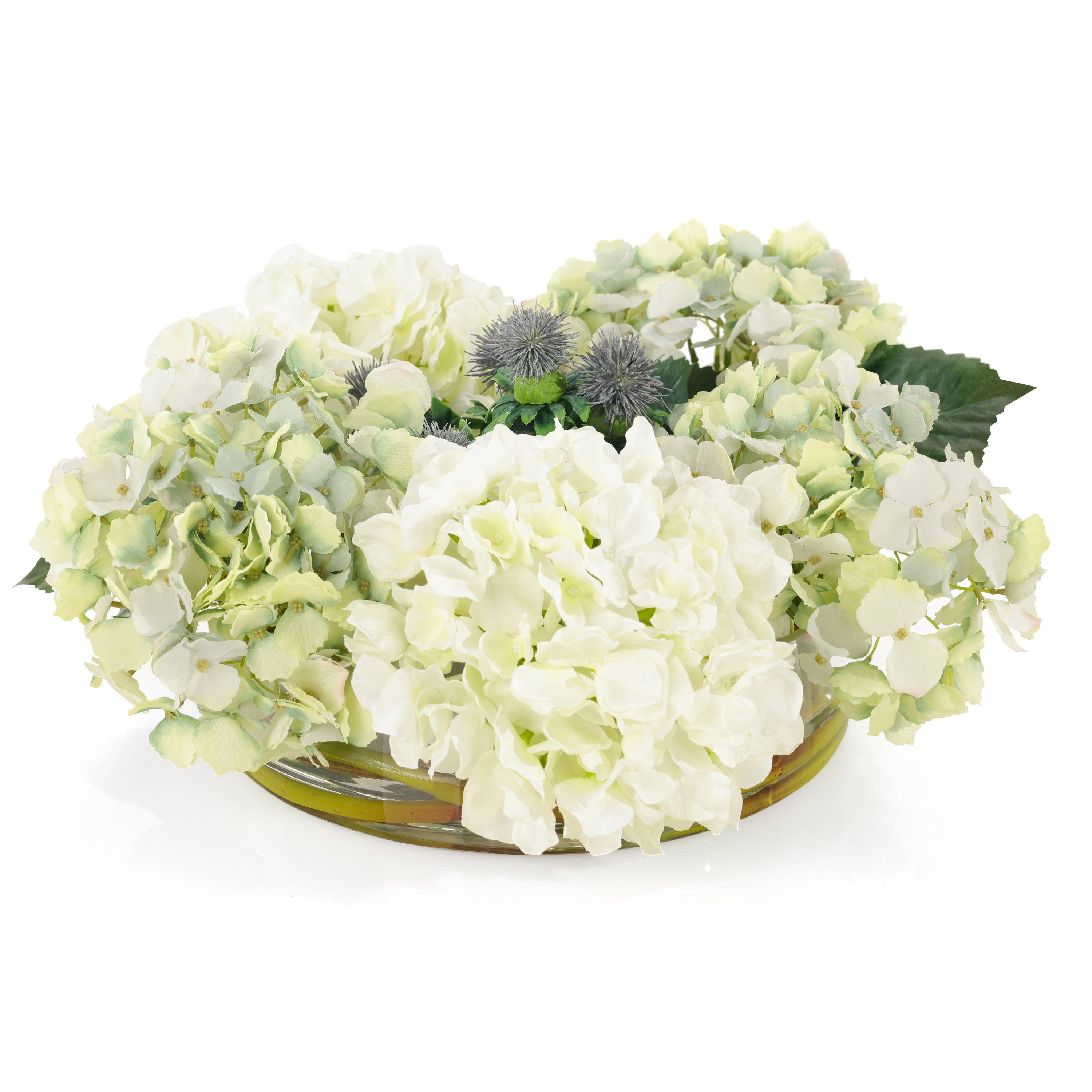 Pastel Hydrangeas is a stunning hydrangea arrangement that balances crisp whites with pastel blues and greens, accented with blue safflowers. The display is held within a round, clear glass bowl with faux water.