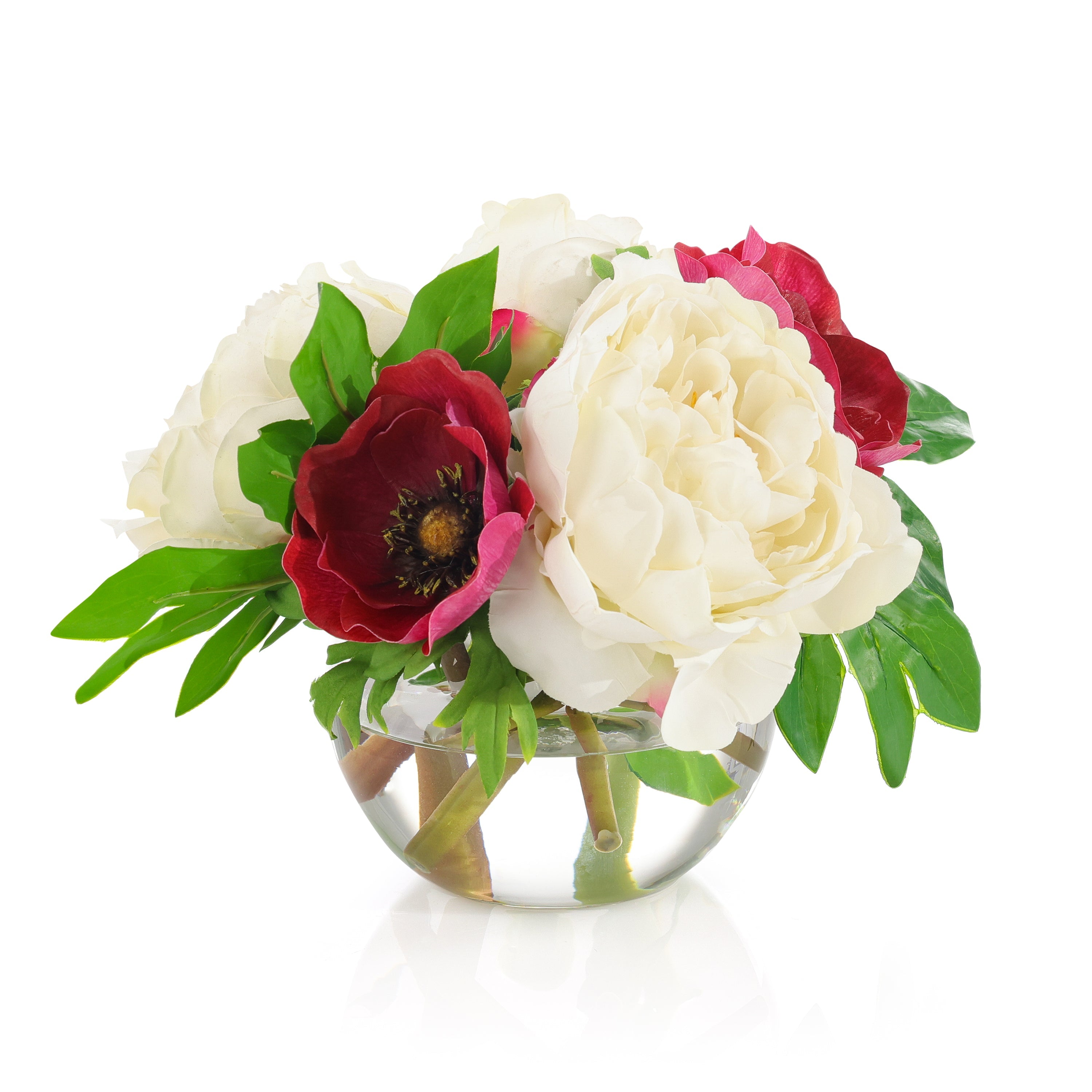 Real Touch Peonies is a gorgeous floral arrangement including real touch peonies and anemone, showcasing a delightful cream and red color palette. These stunning flowers are held within a clear glass bowl complete with faux water.