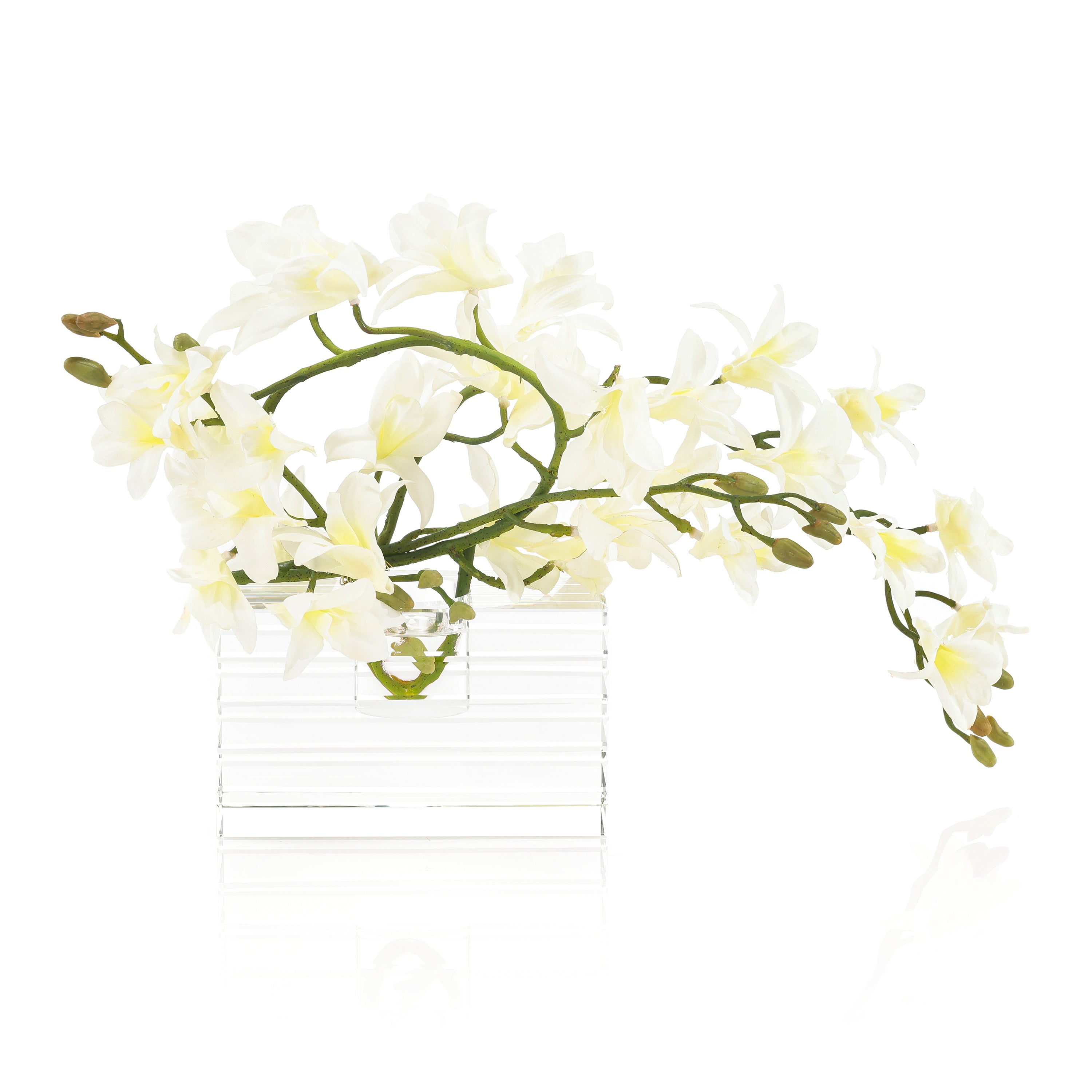 Rock Crystal Orchids is a beautiful display of white dendrobium orchids. The arrangement is showcased from a contemporary, clear crystal vase with faux water.