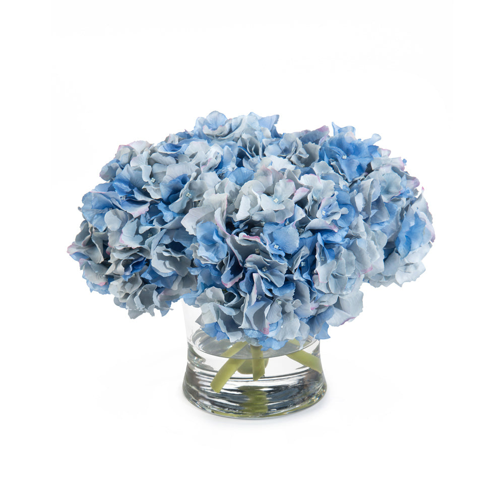 A concave glass vase is filled with evening blue hydrangeas in faux water.
