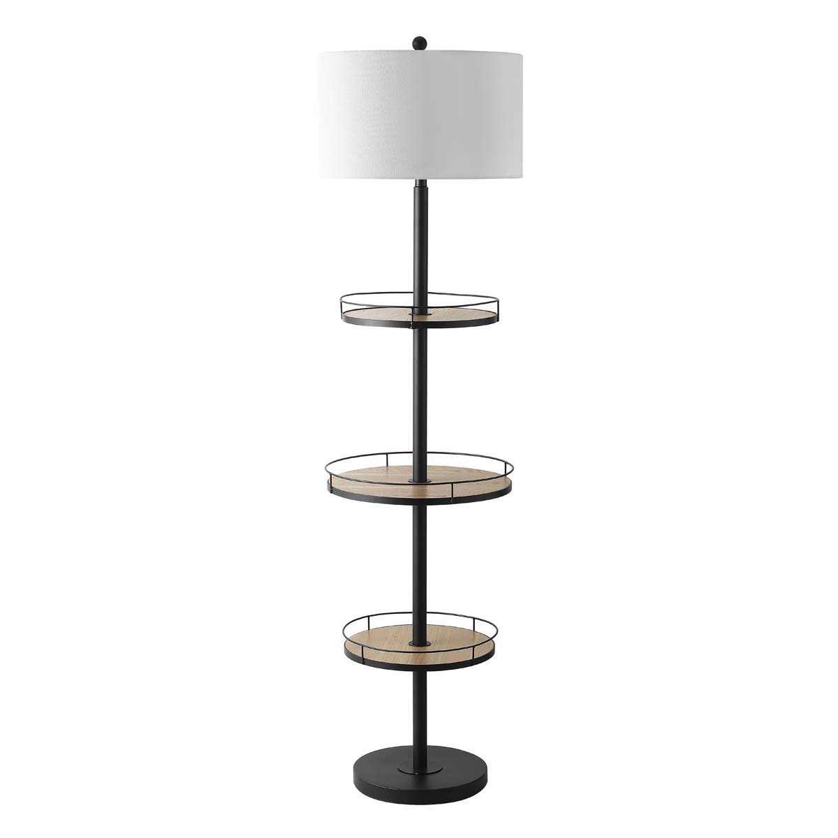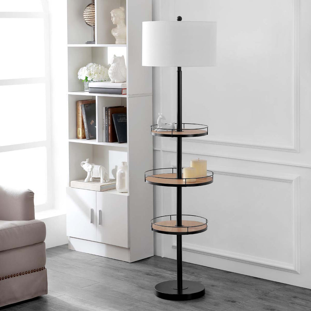 Display your trinkets or store remotes, books, and magazines while casting a soft glow in any room with this Bello Floor Lamp. Three circular wood shelves surrounding a matte black stand provide ample storage, its varying sizes add a chic sense of depth to modern d?cor.