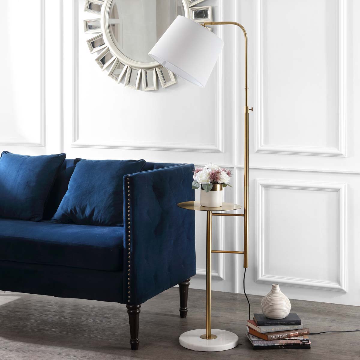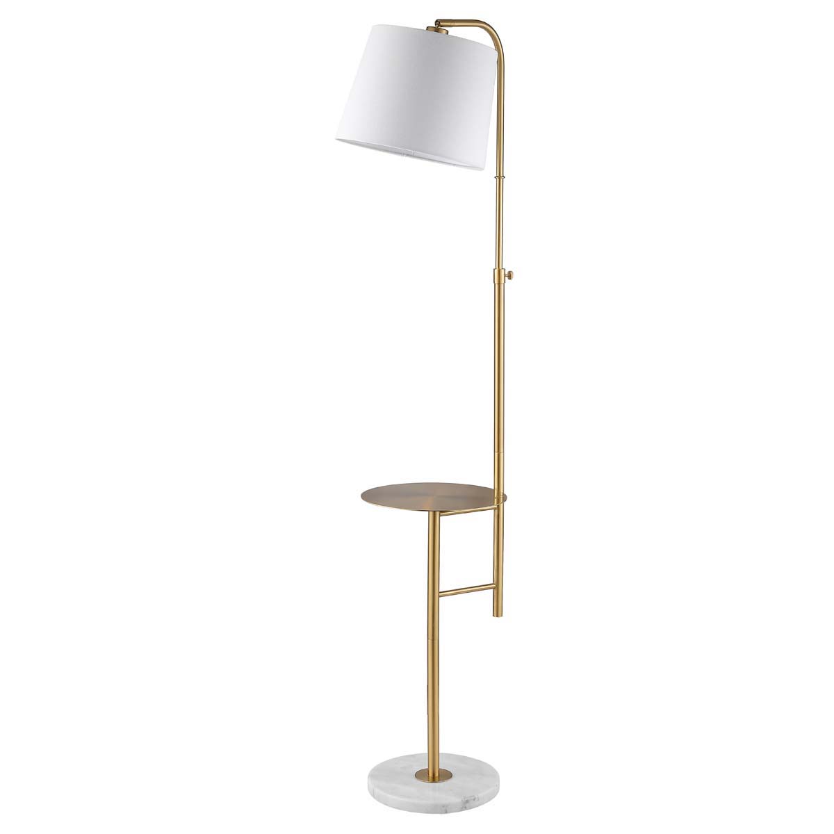 This Sorsi Floor Lamp combines a glamorous accent table with soft overhead lighting, perfect for elevating the elegance of small space interiors. Sorsi boasts its sculptural style with a brass gold body and white marble base, an angled linen shade enhancing its striking sense of motion.