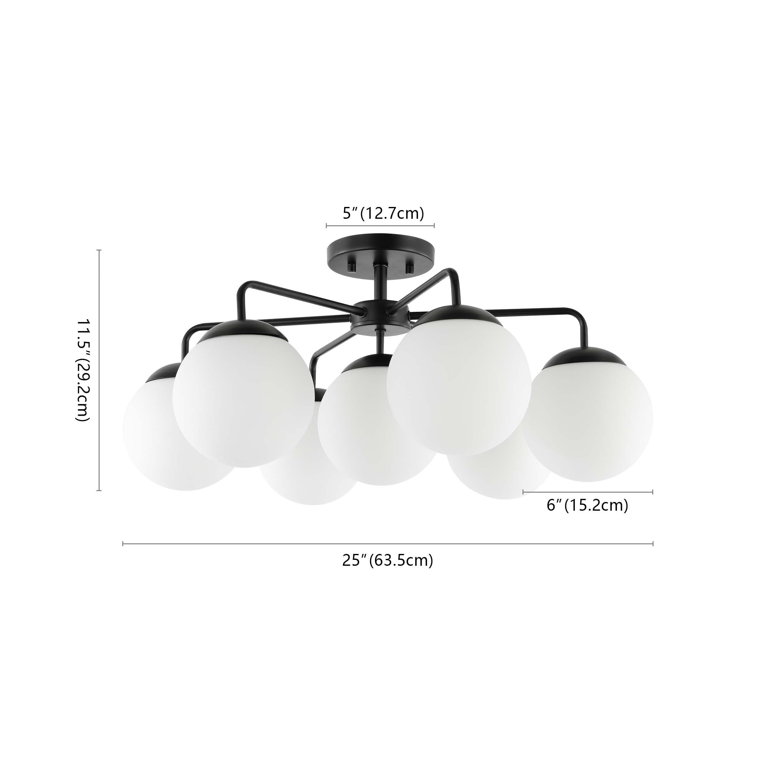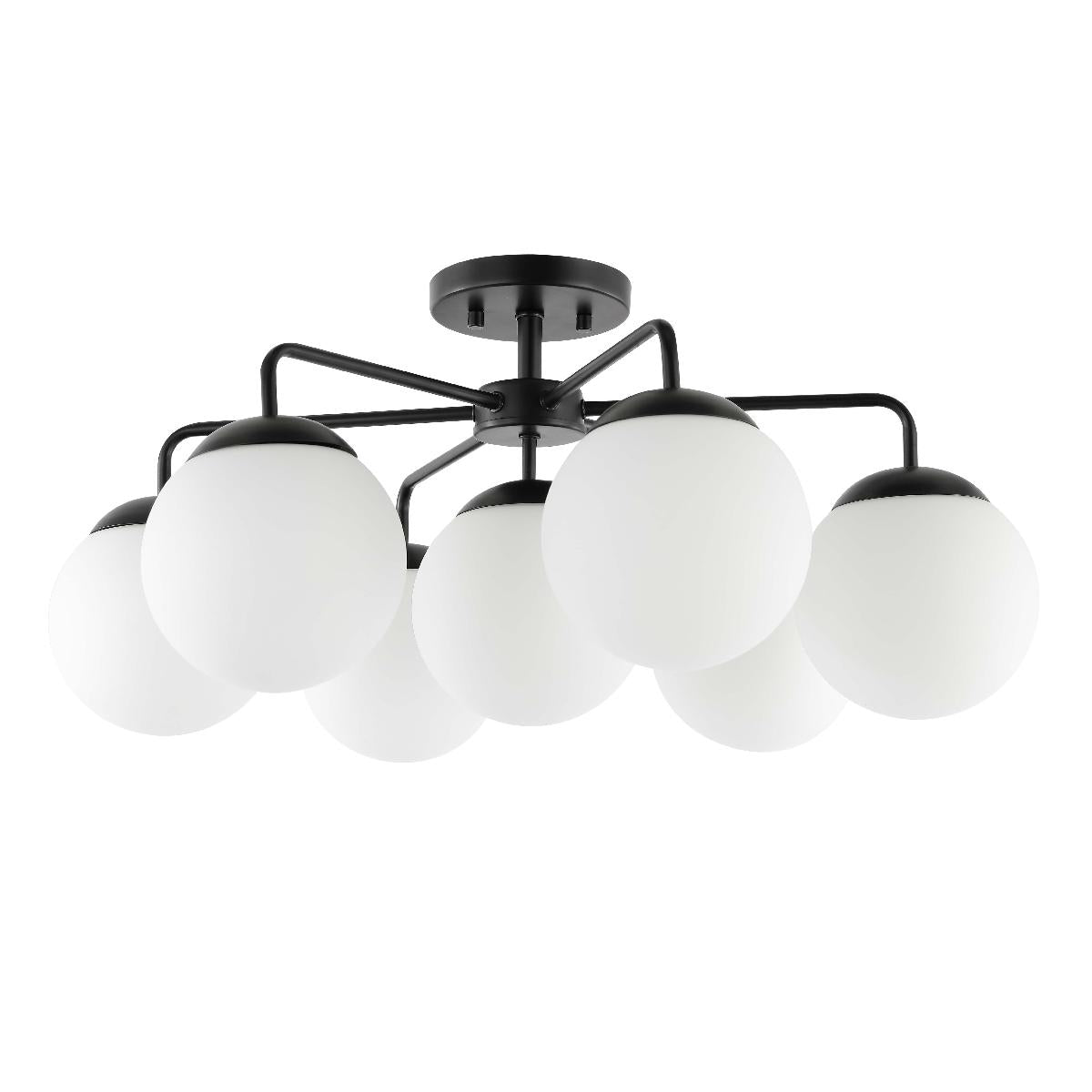 A new take on retro Sputnik-style lighting, this Camdyn Flush Mount is simply outstanding. Camdyn?? climactic cluster of seven white glass orbs reinvigorates any room, and its jet black finish makes it effortlessly chic.
