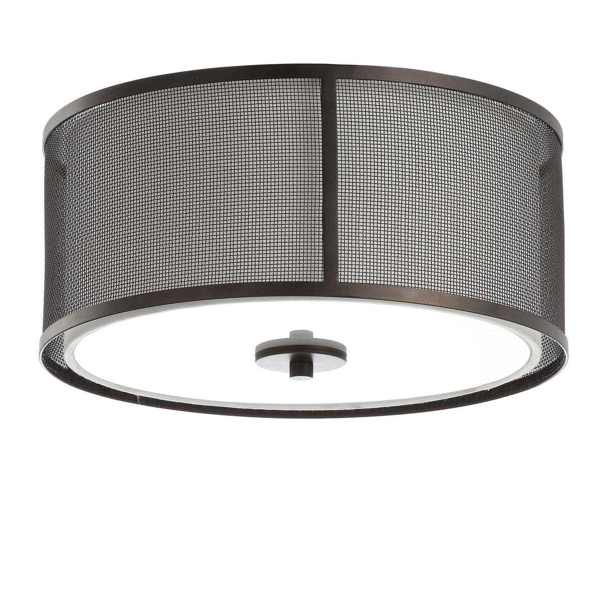 Take any interior to new heights with this contemporary flush mount ceiling light. Its versatile design features a metal shade with a cut out diamond pattern and classic iron finish. A white 100% cotton shade on the inside creates a glowing ambiance.