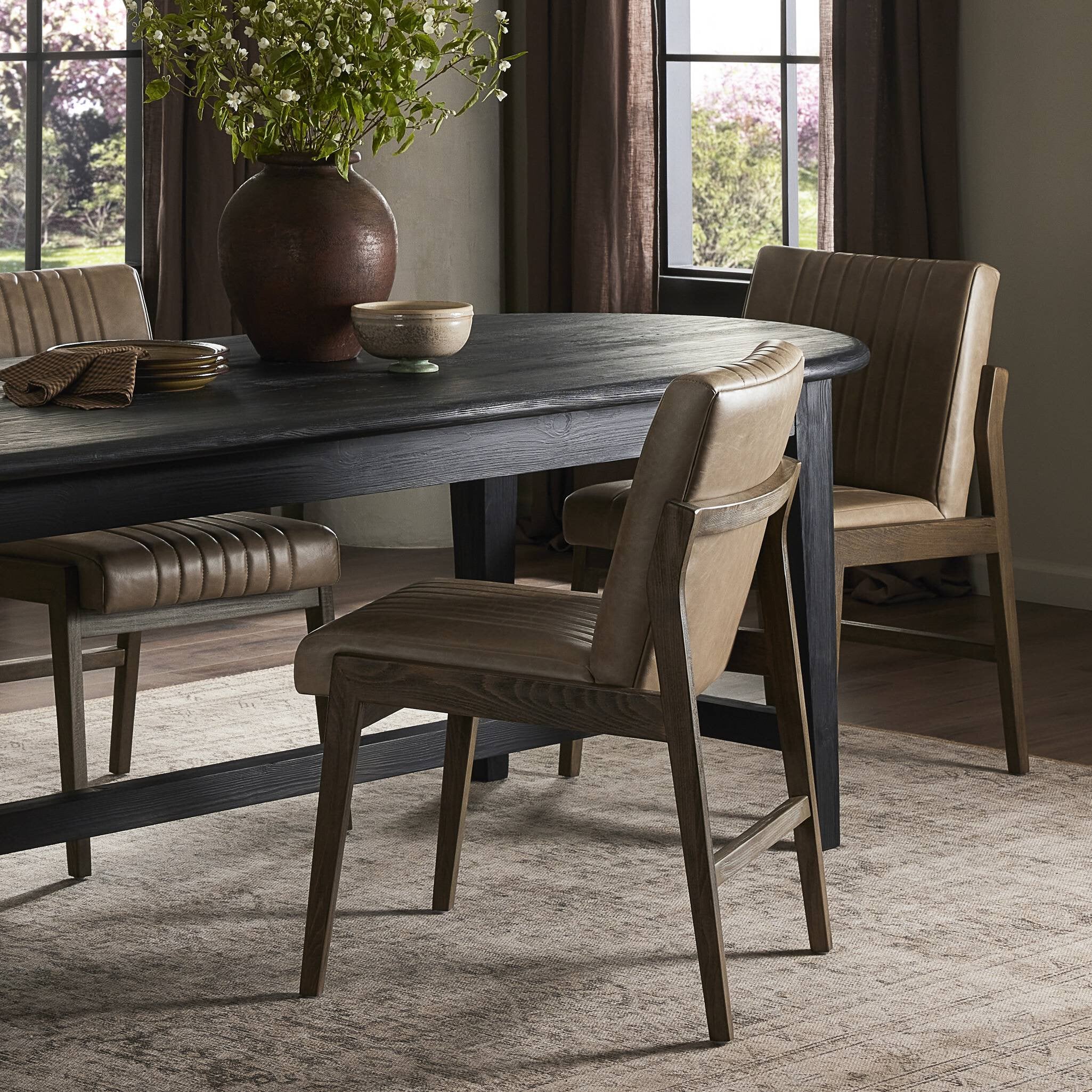 Vertical channeling and grey top-grain leather exclusive to Four Hands grant this '50s-inspired dining chair new energy. Finished in a rich brown, beech wood framing features a rear scalloped stretcher for added intrigue.