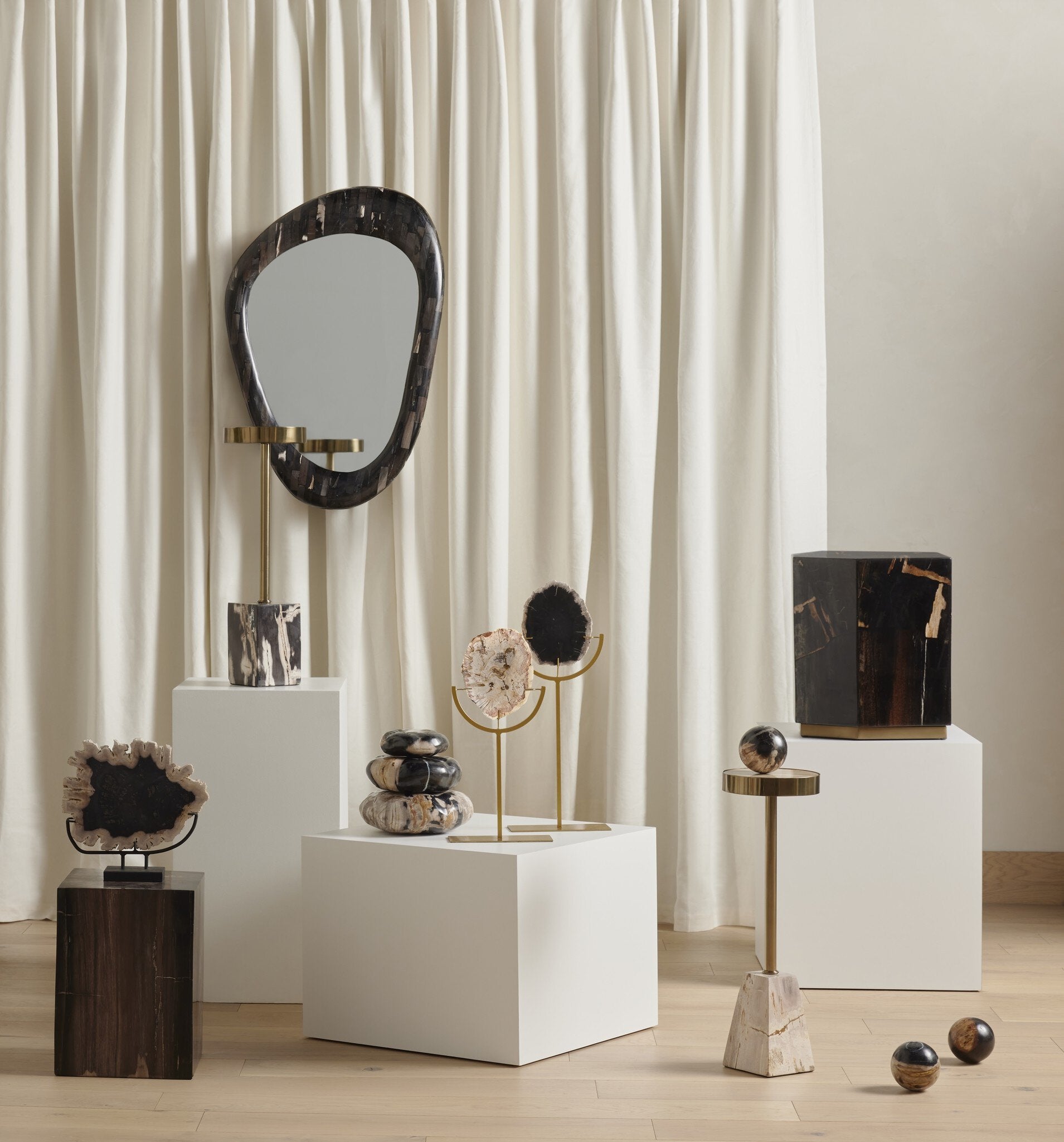 Go natural. Go bold. Made from fossilized petrified woods with a brass-finished stainless steel post, a slim silhouette works into any space with ease.