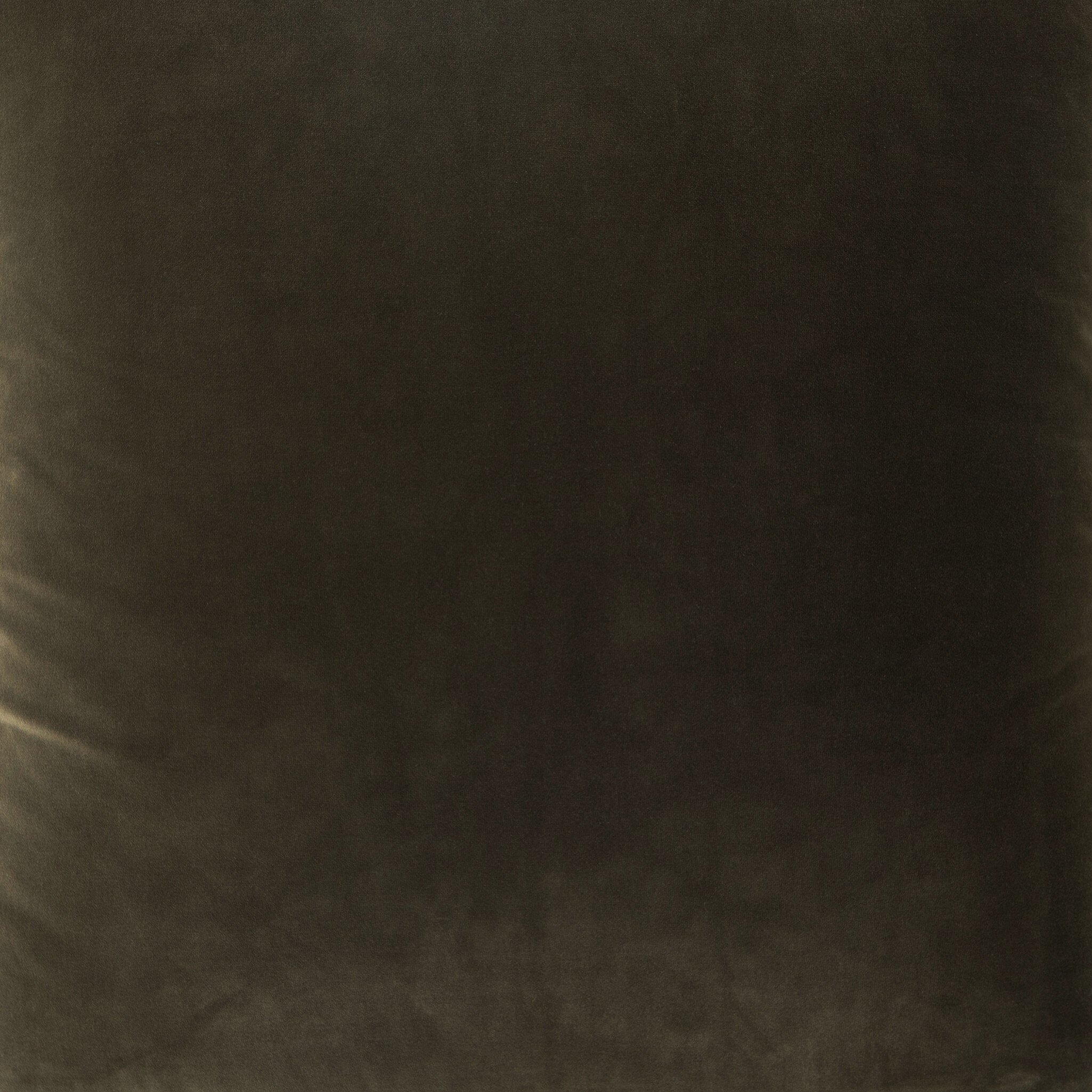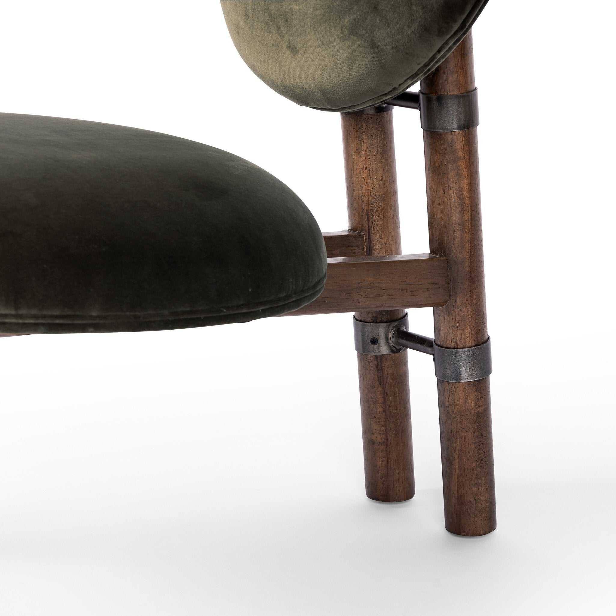 A playful take on Italian modernism. Solid parawood crafts a slim, curved frame and rear mock-tripod. Upholstered in a velvety olive-colored cotton-poly with subtle highs and lows that change in appearance depending on the direction of the fabric's nap.