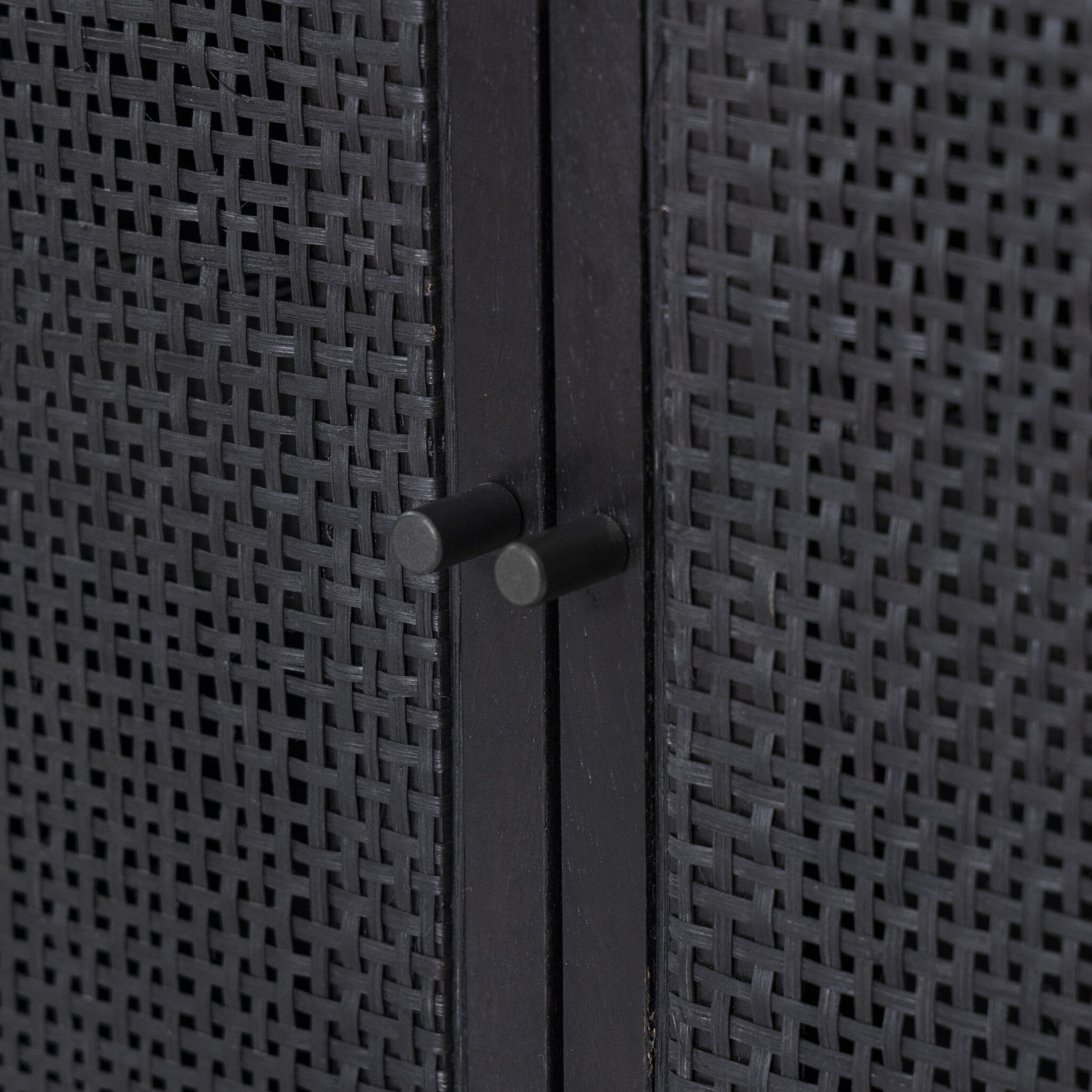 Mid-century-inspired style with an organic twist. Surrounded by mango casing, light cane weaves for a fresh look with natural depth. Angular gunmetal-finished iron legs offer an intriguing contrast of texture and tone.