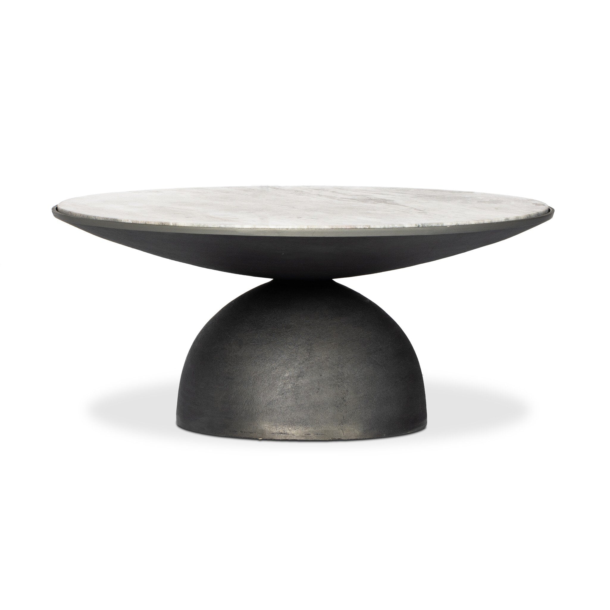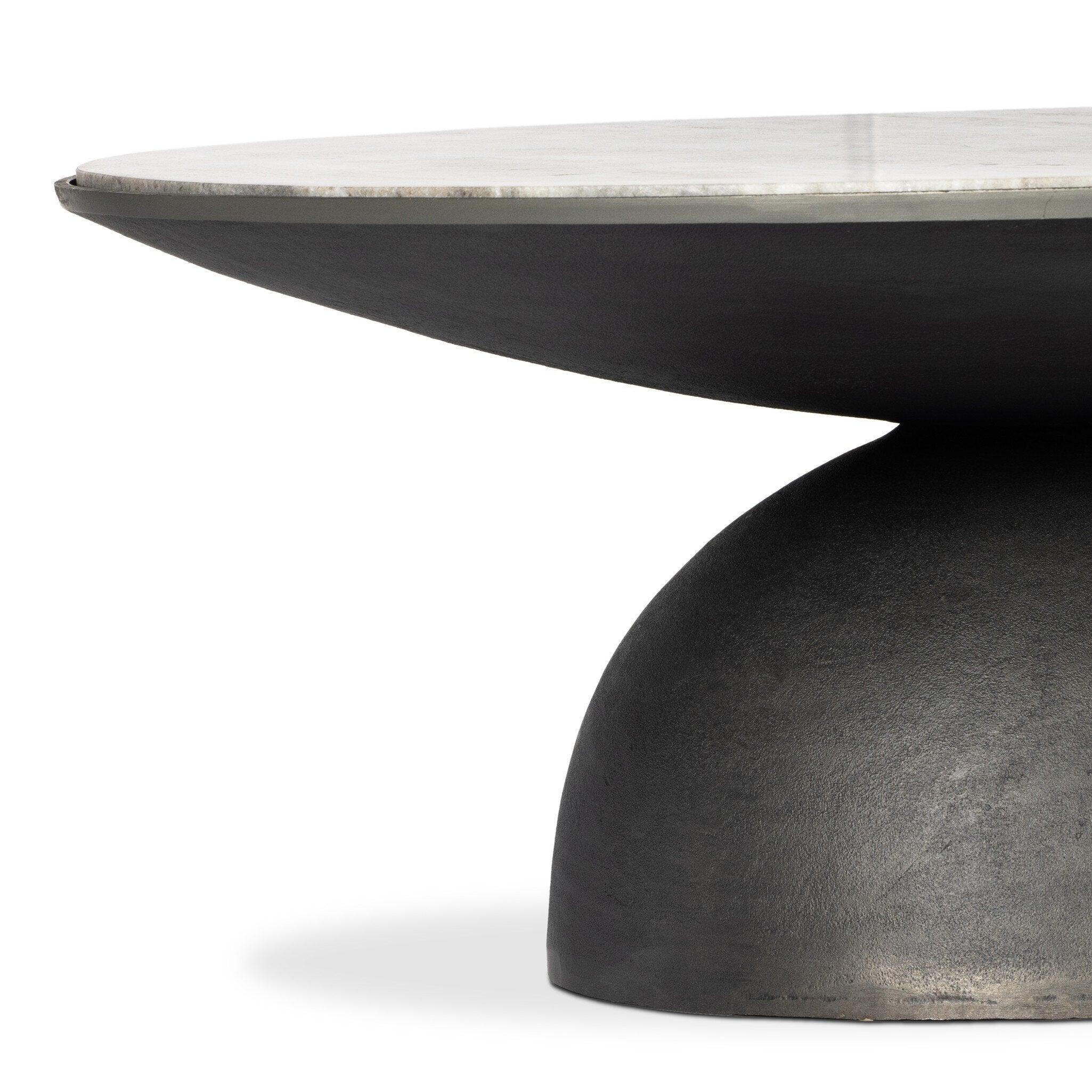A sculptural play on shape. Hammered grey-finished aluminum base supports a solid marble tabletop in complementary grey with striking natural veining.