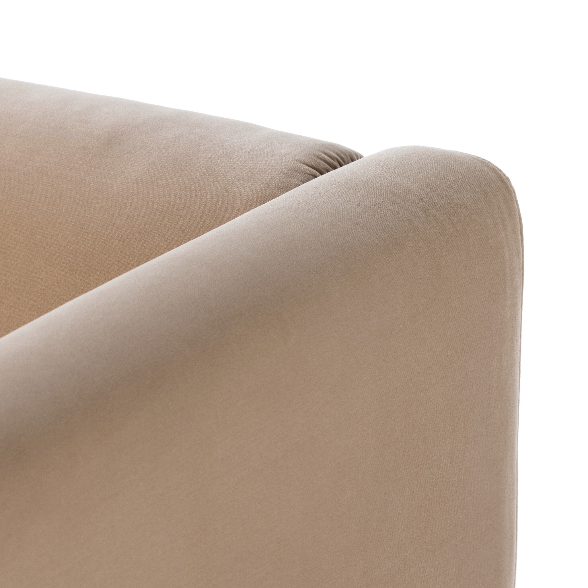 Art Deco gone modern. Velvety taupe upholstery and parawood plinth base fuse for a fresh take on elegant '30s- and '40s-era design.