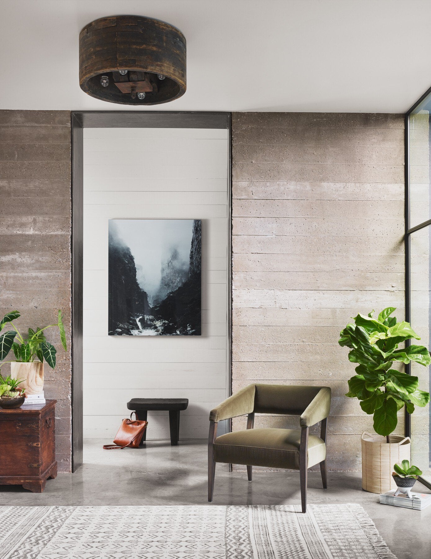 Material and shape share the spotlight. An angular, midcentury-inspired oak frame pairs with velvety olive upholstery. Subtle highs and lows in fabric change in appearance depending on the direction of the fabric's nap.