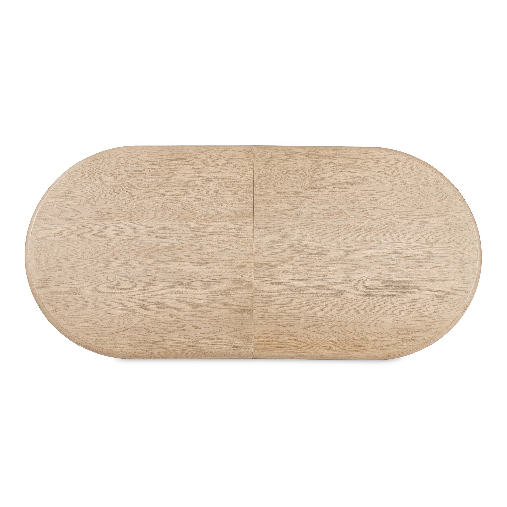 Made from light-finished solid oak, an oval-shaped dining table flaunts eye-catching curves, with an extension feature that expands the table from 87" to a roomier 107".