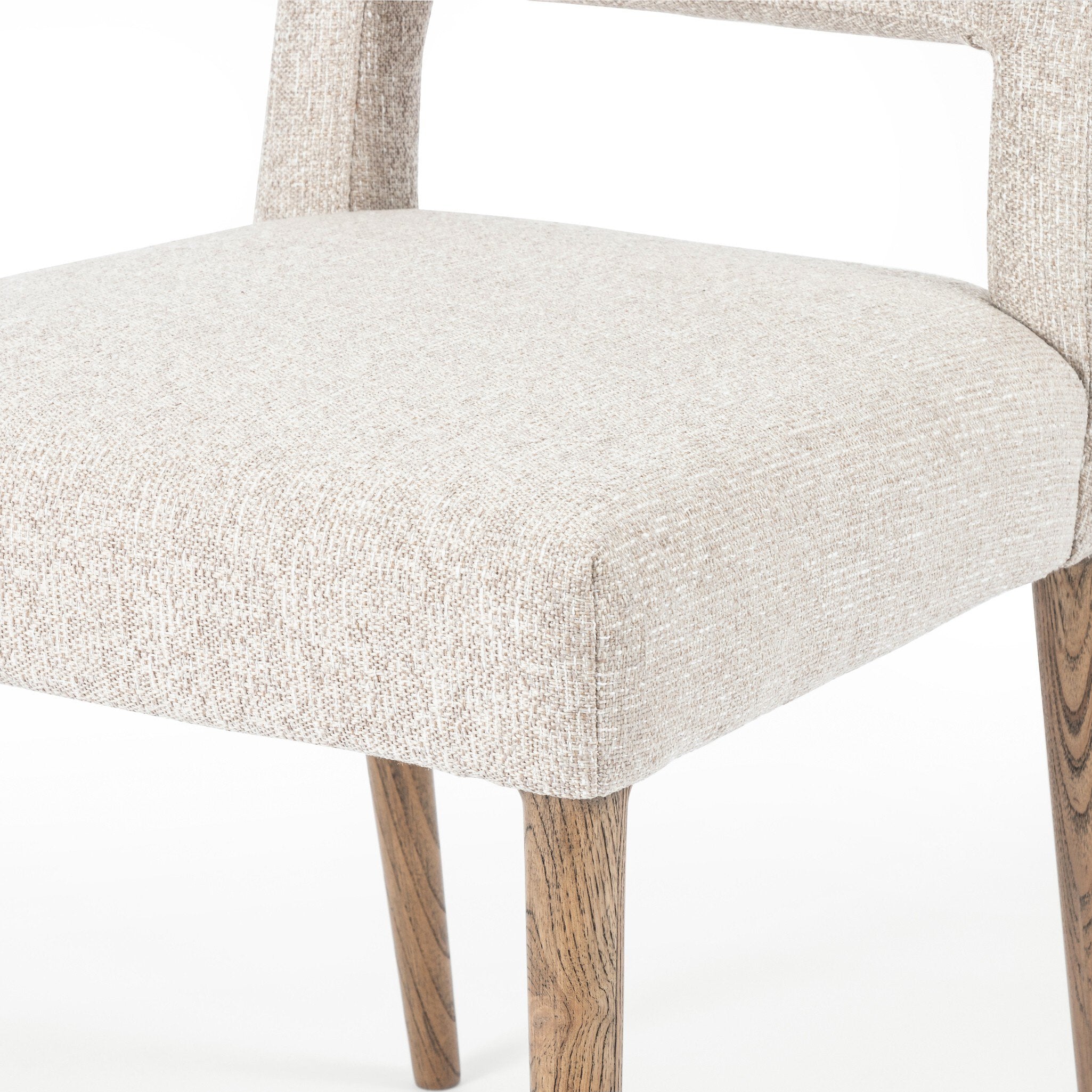 Simply styled and mid-century minded, textural light taupe upholstery features a posterior cutout for added flair, with toasted nettlewood legs for natural contrast.