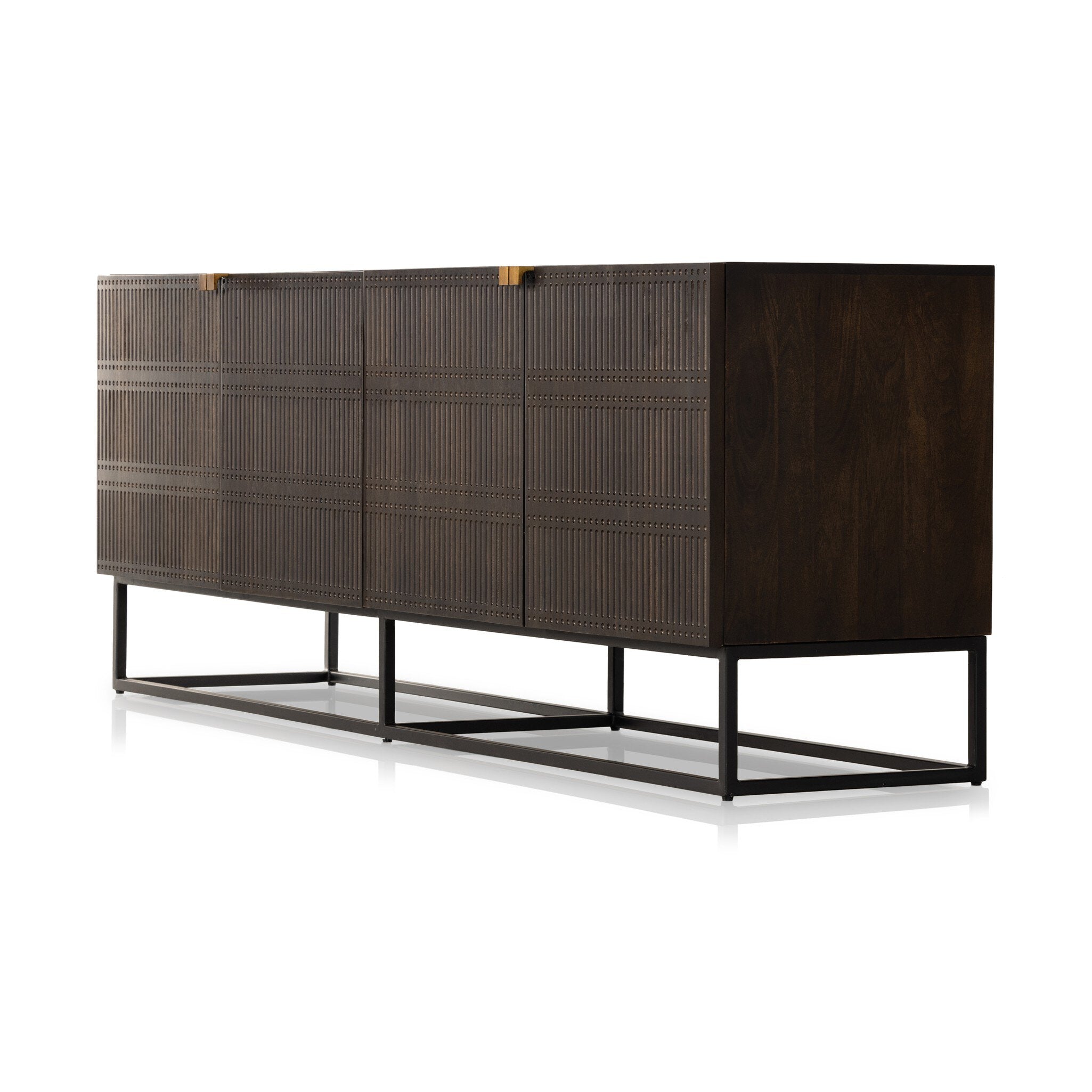 Mango wood's unique linear carving highlights texture and true artisanship. A slim iron base adds an airy, cage-like look to clean-lined storage.