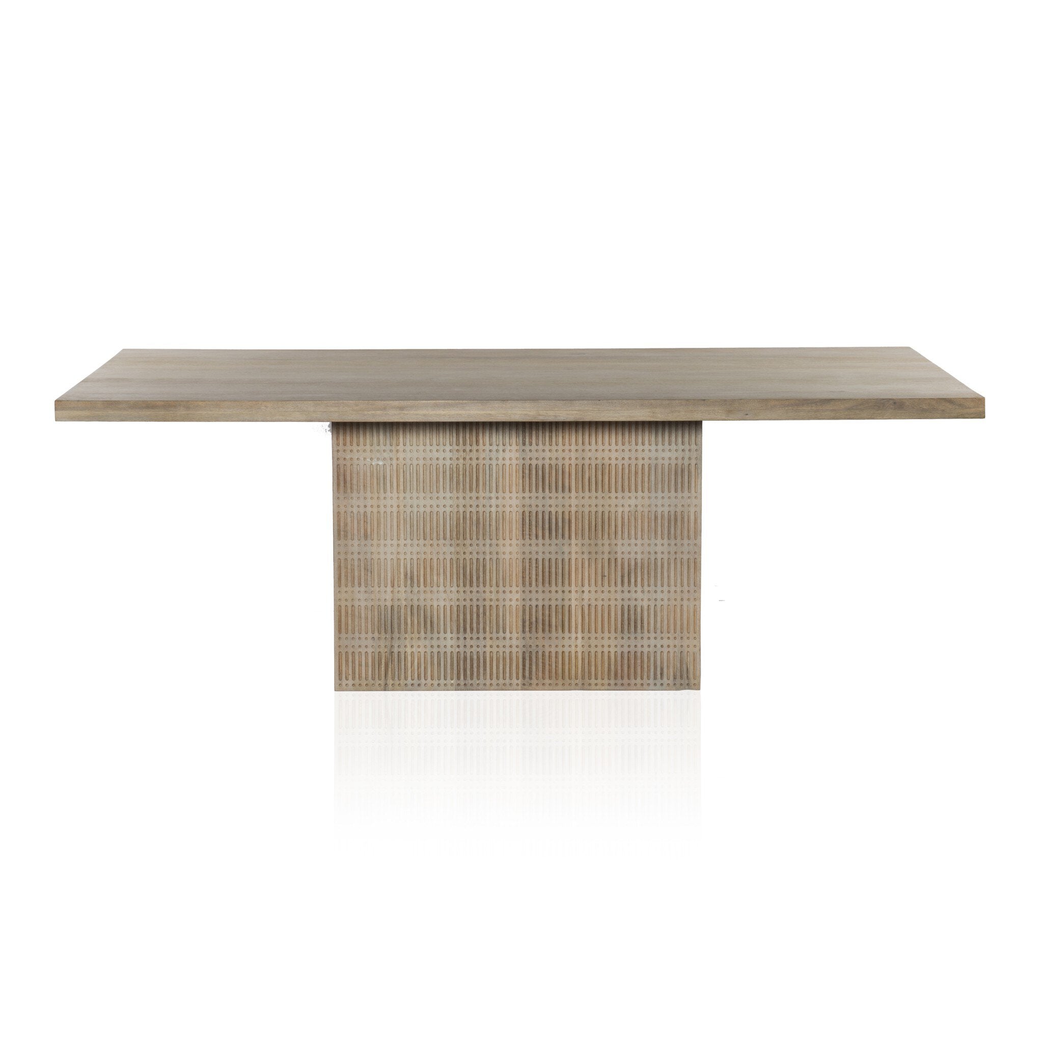 Unique linear carving with an artisan slant. Mango wood is finished in a light wash, highlighting texture and craftsmanship alike. Seats eight comfortably.