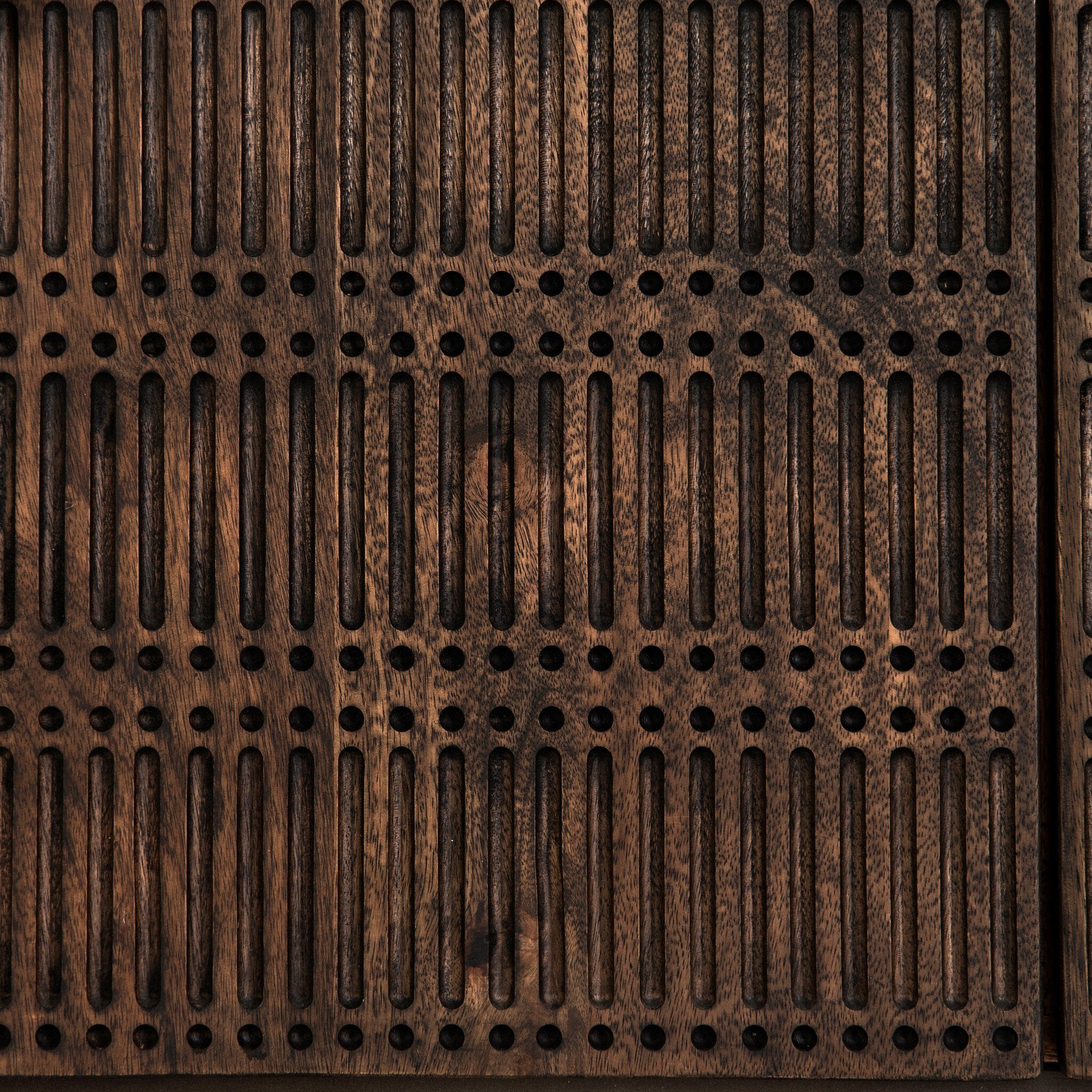 Unique linear carving meets new dimension with an artisan slant. Mango wood casing is finished in a vintage brown, highlighting texture and craftsmanship. A slim iron base adds an airy, cage-like look to small-scale media storage. Rear cutouts for cord management.