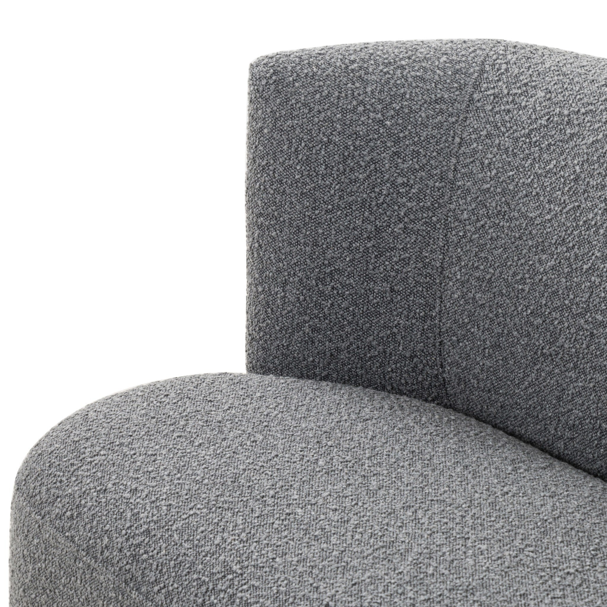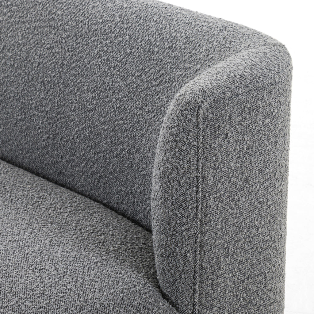 Style takes shape. Comfortably curved bench seating is upholstered in a chunky charcoal boucle, with water-repellent high-performance fabric for modern sensibility. A plinth-style ash veneer base works casual contrast into the mix. Perfectly sized for a cozy breakfast nook; pair up to suit a larger space.