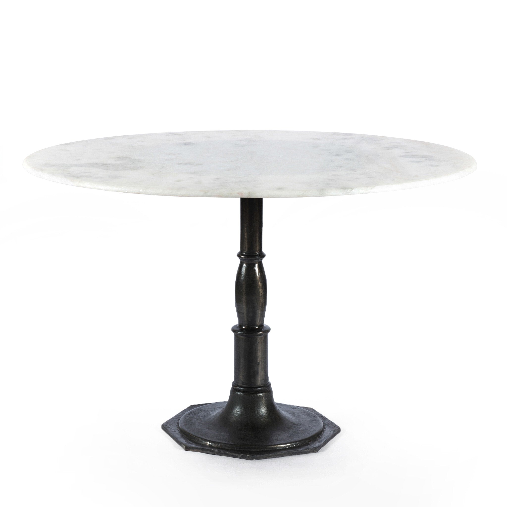 French industrial meets dining table. Beautifully detailed, 8-sided cast iron pedestal supports a dramatic white marble top with a bull-nosed edge.