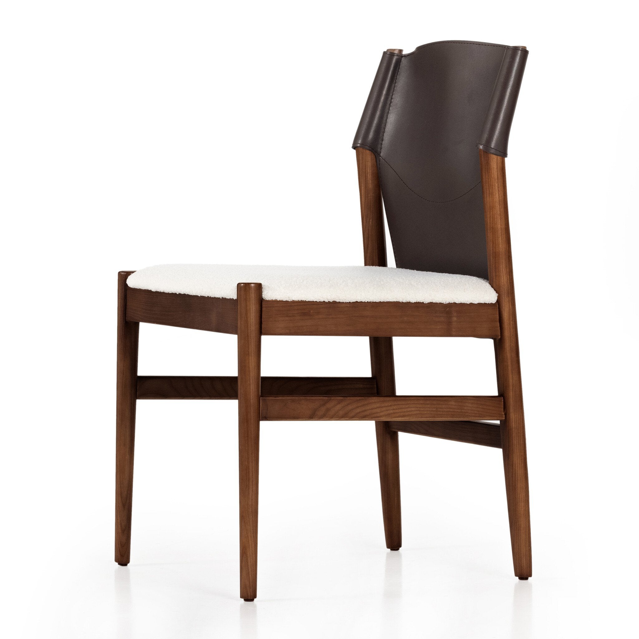 Sleek, streamlined seating with a midcentury vibe. Armless dining chair features a sling leather seatback and a faux shearling seat in liquid-repellent performance fabric. Frame and legs made of solid ash wood.